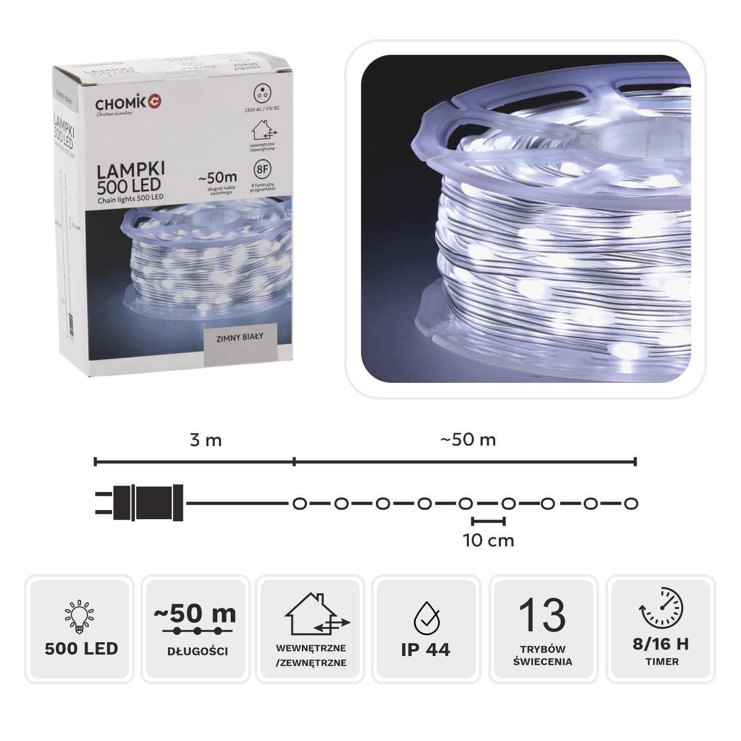 Het LED micro-lichtsnoer op een praktische haspel zorgt voor een egale, koudwitte verlichting over 50 meter. Dankzij het hoge aantal van 500 diodes met een onderlinge afstand van 10 cm is het ideaal voor kerstbomen, balustrades, pergola’s en etalages. De transparante isolatie gaat subtiel op in de omgeving en laat enkel het licht opvallen.