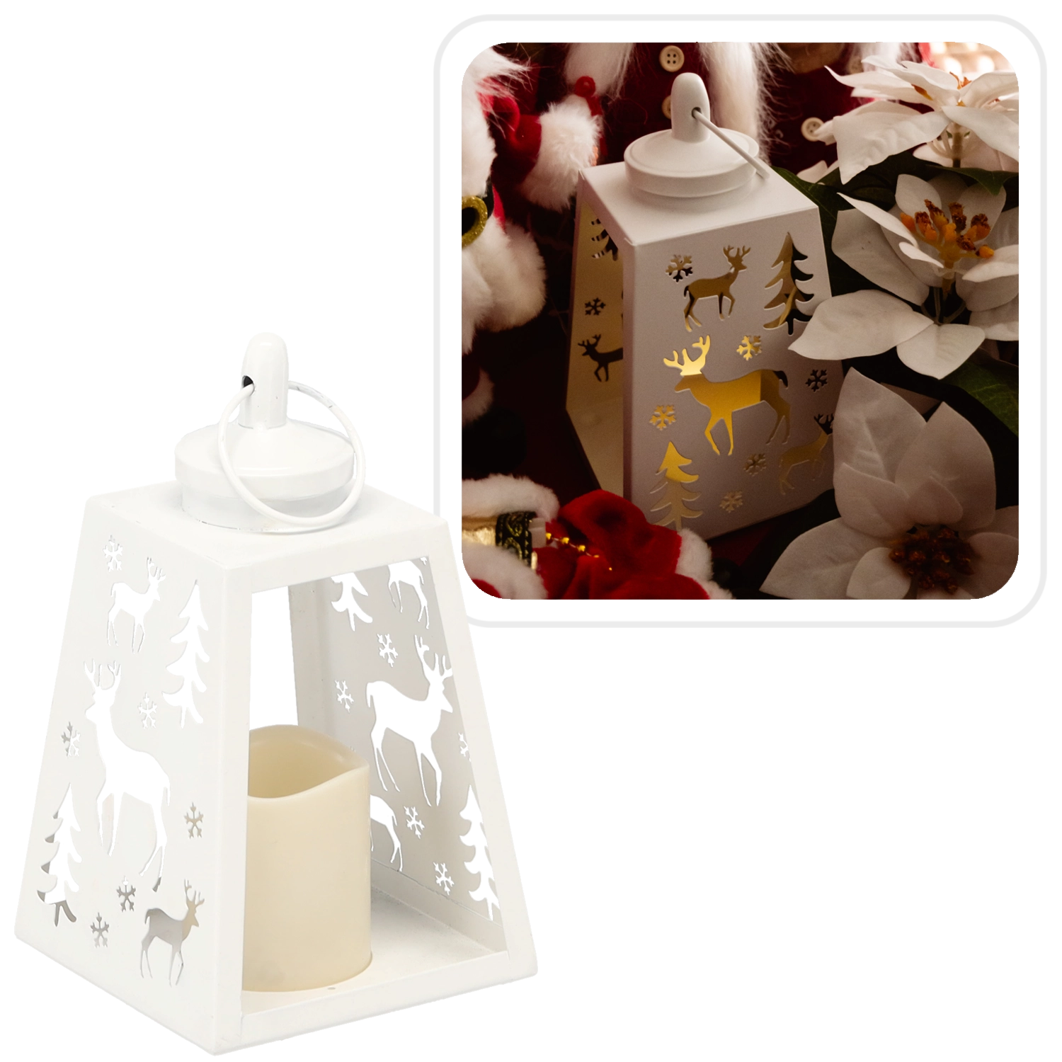 - Stijlvol design – witte metalen behuizing met rendiermotief