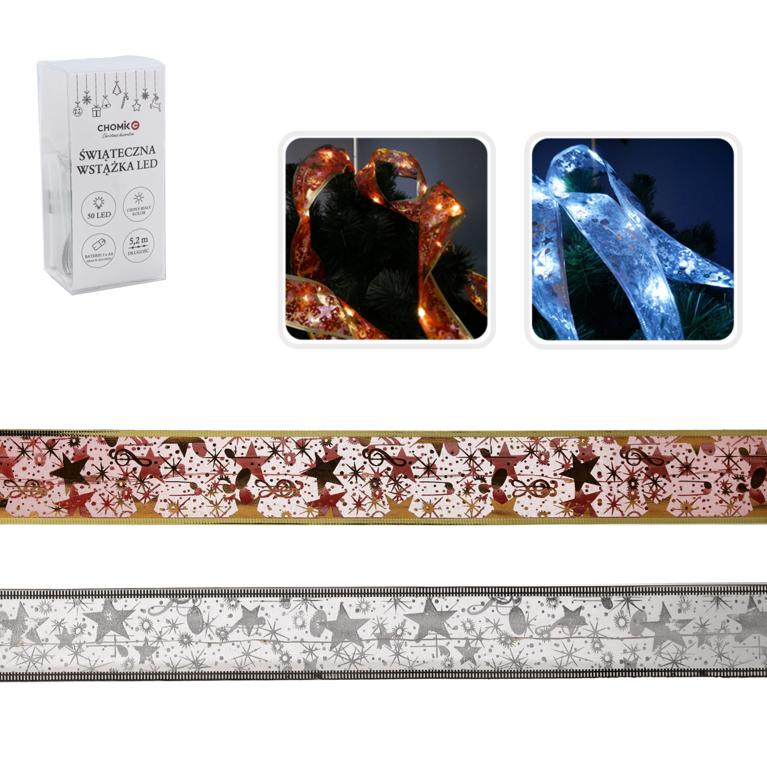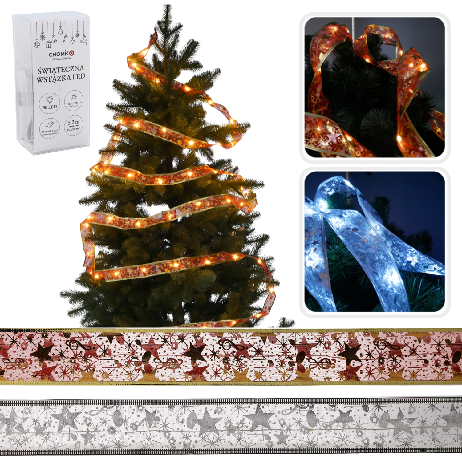 Het lint is perfect voor het versieren van de boom, het rangschikken van kransen, het decoreren van de schouw, planken en balustrades. Het universele design in rood‑goud of zilver laat zich eenvoudig combineren met zowel traditionele als moderne kerstdecoraties.