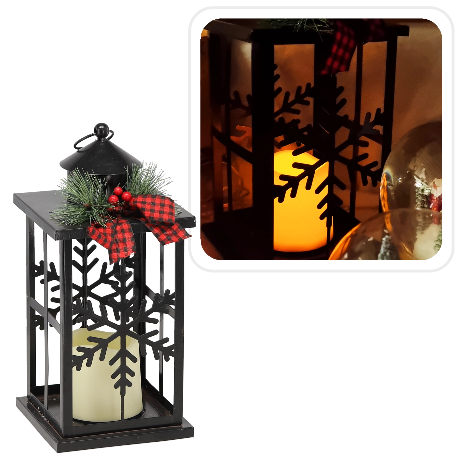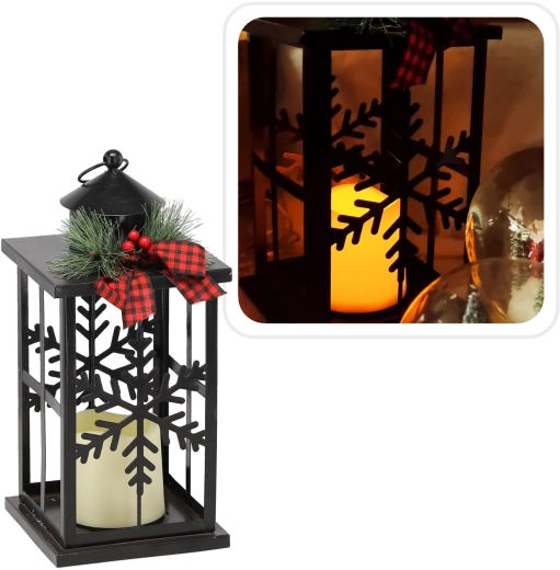 Elegante kerstlantaarn in zwart metaal die je huis een knusse gloed en feestelijke sfeer geeft. De decoratie is voorzien van verfijnde motieven van sneeuwvlokken, een stijlvolle strik en warm LED-licht dat veilig en energiezuinig is. Ideaal als decoratie op tafel, dressoir of vensterbank.