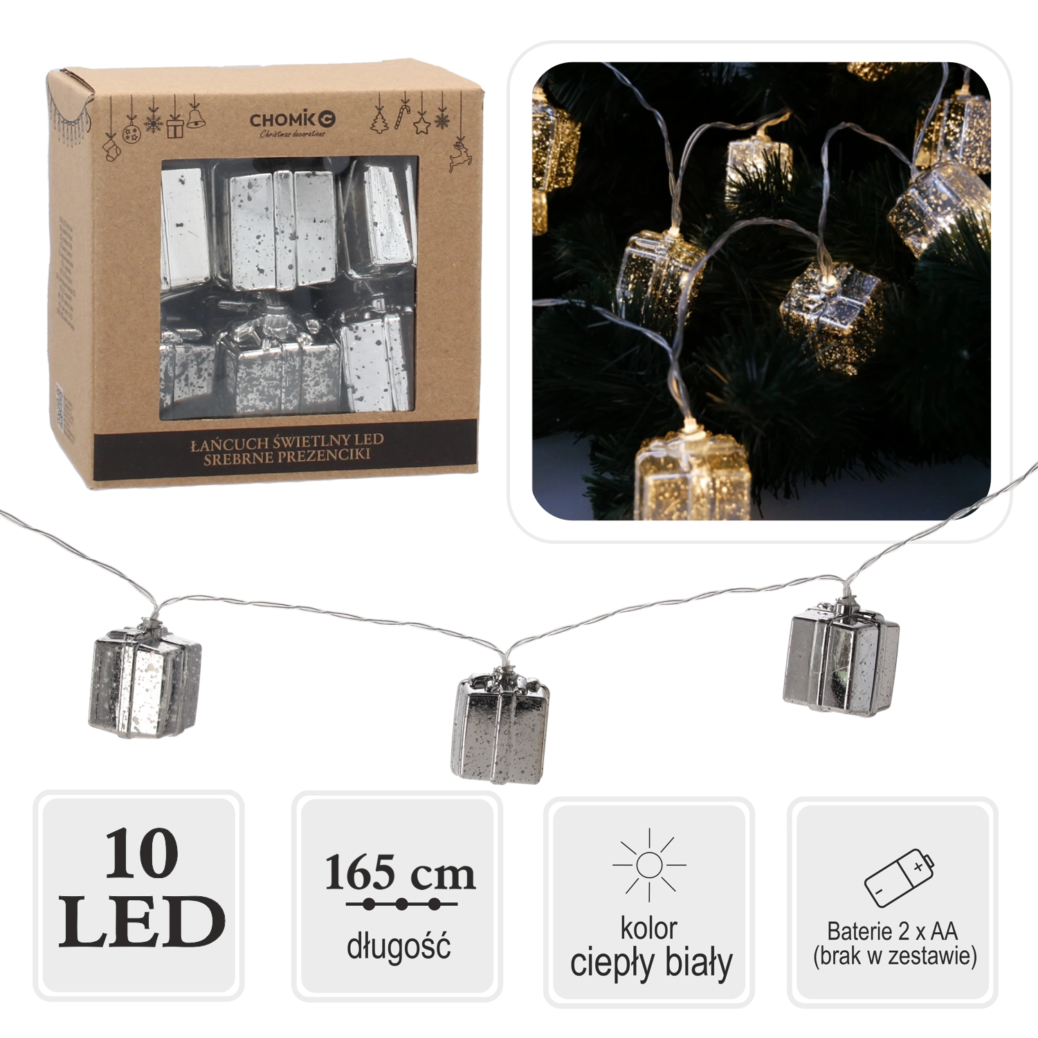 Stijlvol LED-lichtsnoer met zilveren cadeautjes en 10 warmwitte LED's voor een gezellige, feestelijke sfeer overal in het interieur. Dankzij de 2× AA batterijaandrijving heb je volledige plaatsingsvrijheid zonder kabels – op een plank, spiegel, krans of klein boompje. Het zachte, warme licht benadrukt de knusheid en elegantie van je decoraties.