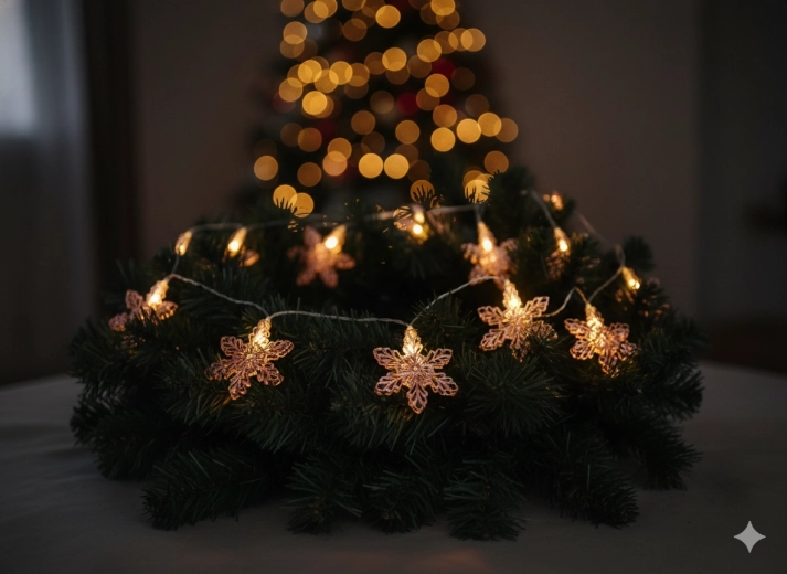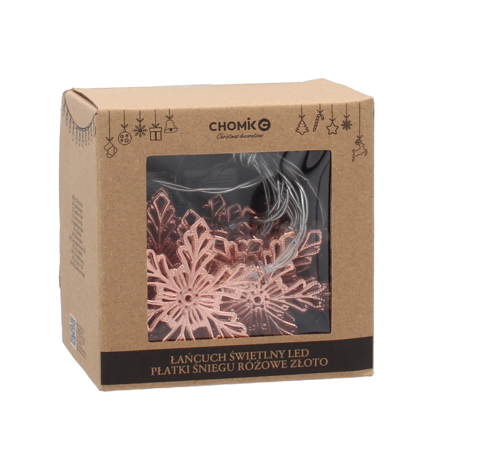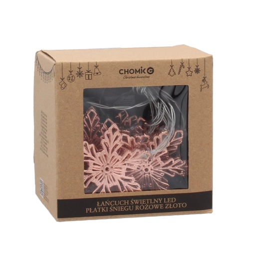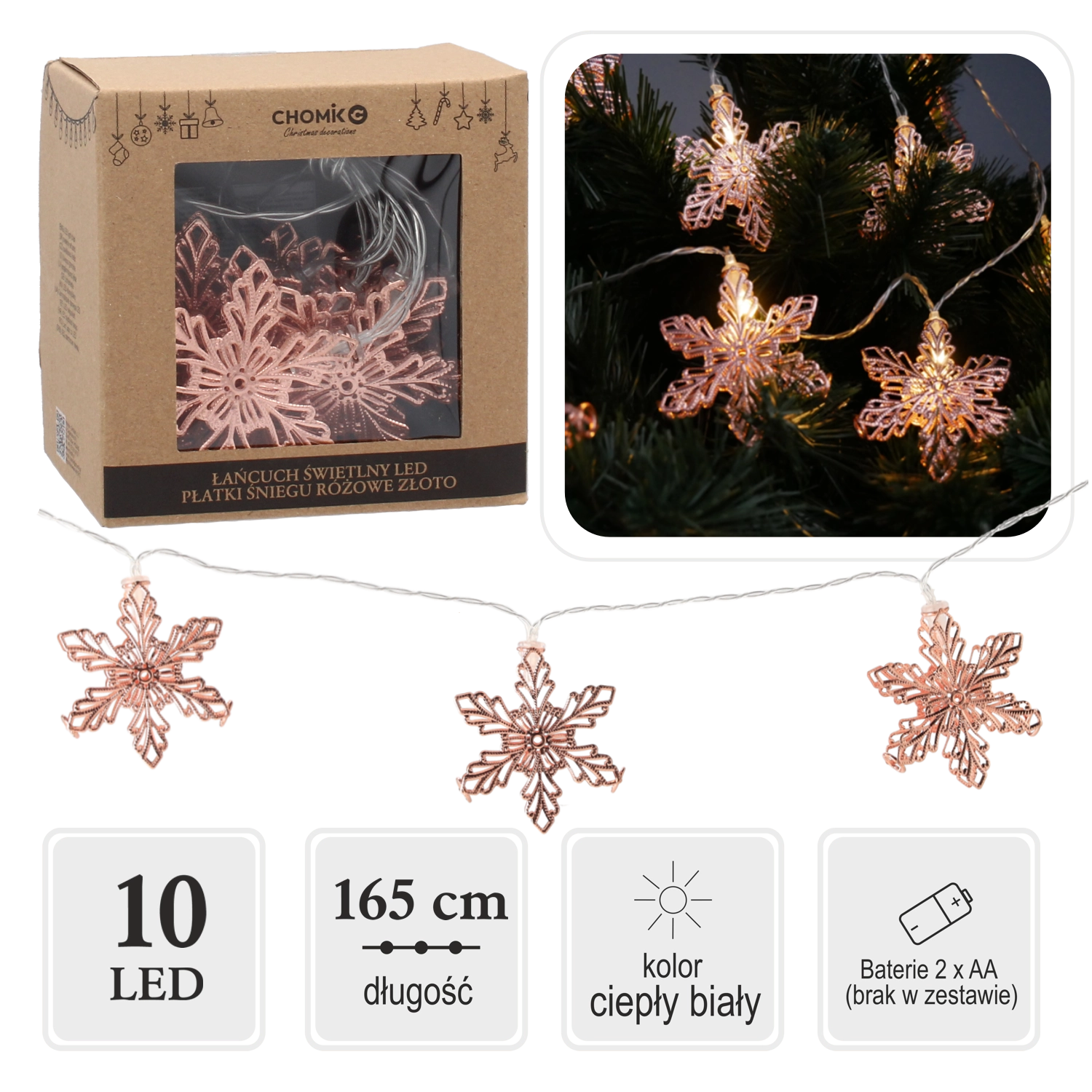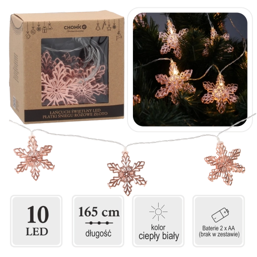 Creëer een winterse sfeer met een elegante LED-lichtslinger in de vorm van sneeuwvlokken in roségoud. 10 warmwitte LED's zorgen voor een gezellige, feestelijke ambiance, terwijl de voeding op 2× AA-batterijen maximale plaatsingsvrijheid zonder kabels biedt.