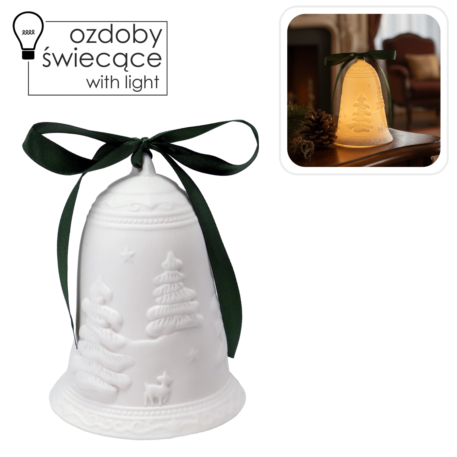 Een groene lint maakt het mogelijk om aan de boom of aan een krans te hangen, terwijl de vlakke bodem zorgt voor stabiele plaatsing op tafel, plank of vensterbank.