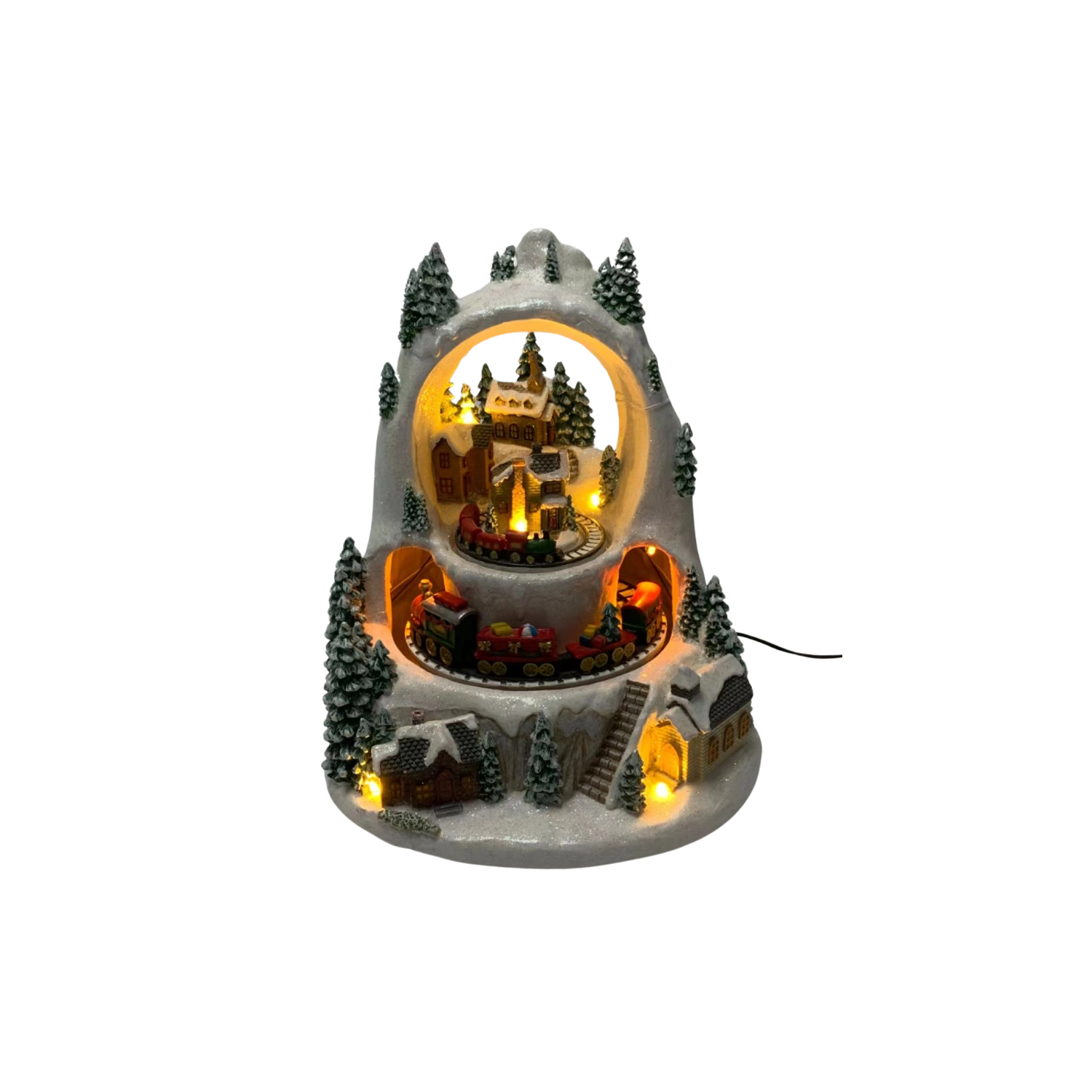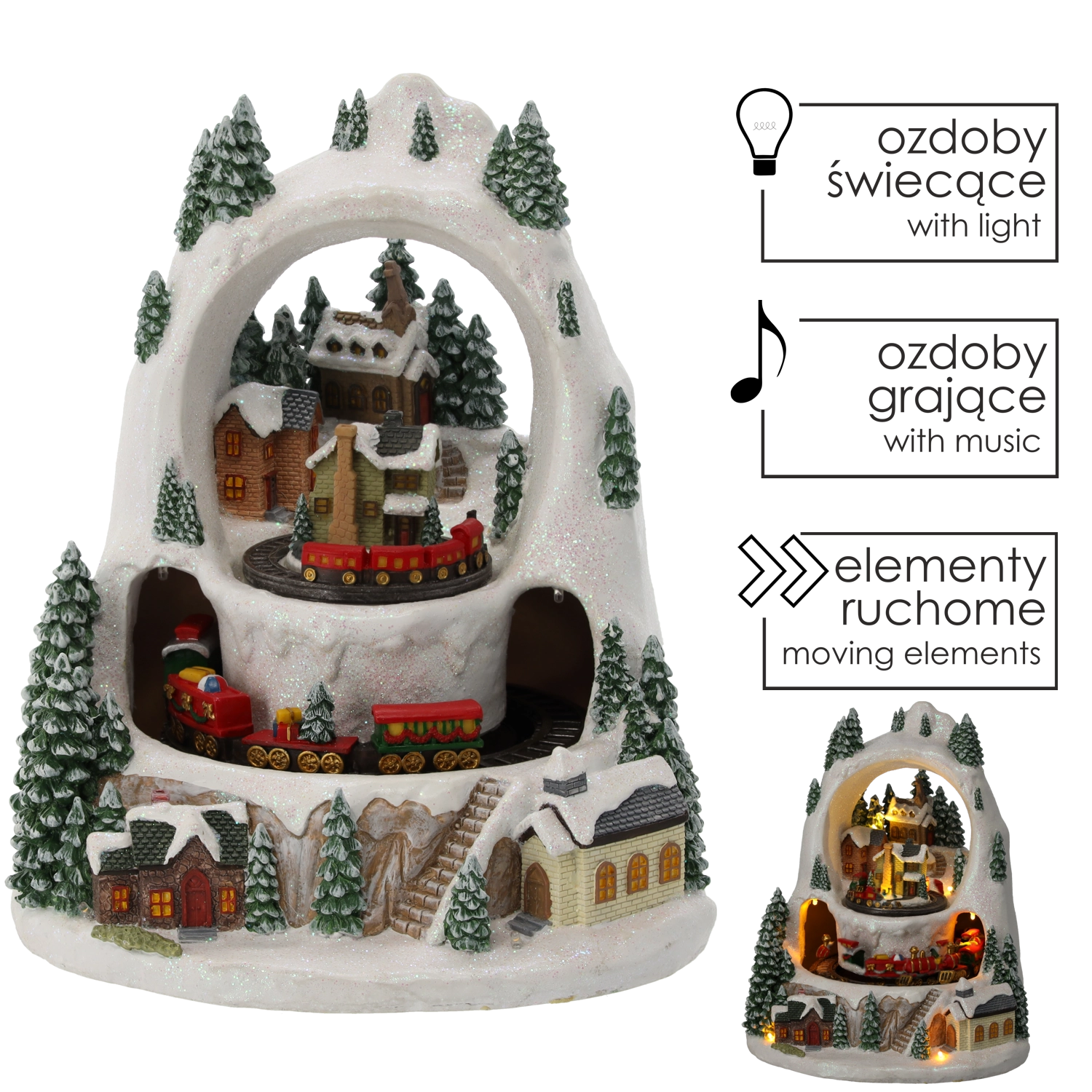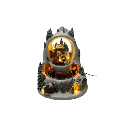 Creëer thuis een klein winterwonder. Het gedetailleerde kerstdorp met besneeuwde huisjes en bomen komt tot leven door de beweging van treintjes op twee niveaus, het prettig warme ledlicht en de mogelijkheid om klassieke feestmelodieën af te spelen. Kies tussen een modus met geluid of een stille werking met alleen licht en animatie.