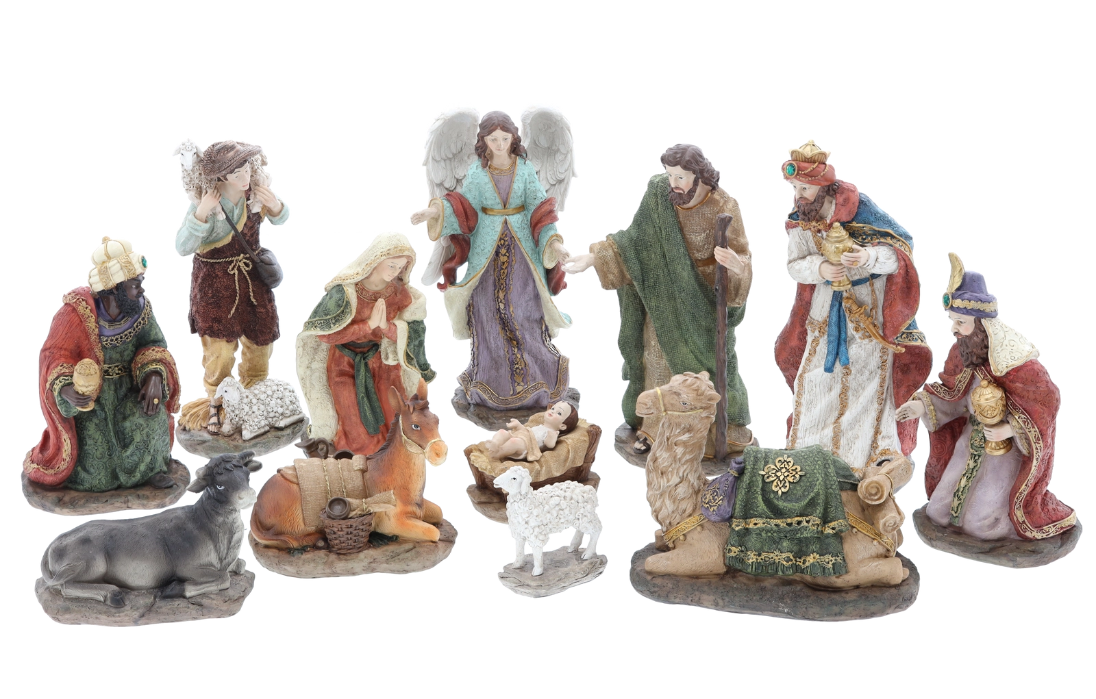 De set bevat de Heilige Familie, de drie koningen, een engel, een herder en dieren – alles in een uniforme stijl en kleurschema voor een harmonieuze kerstdecoratie.