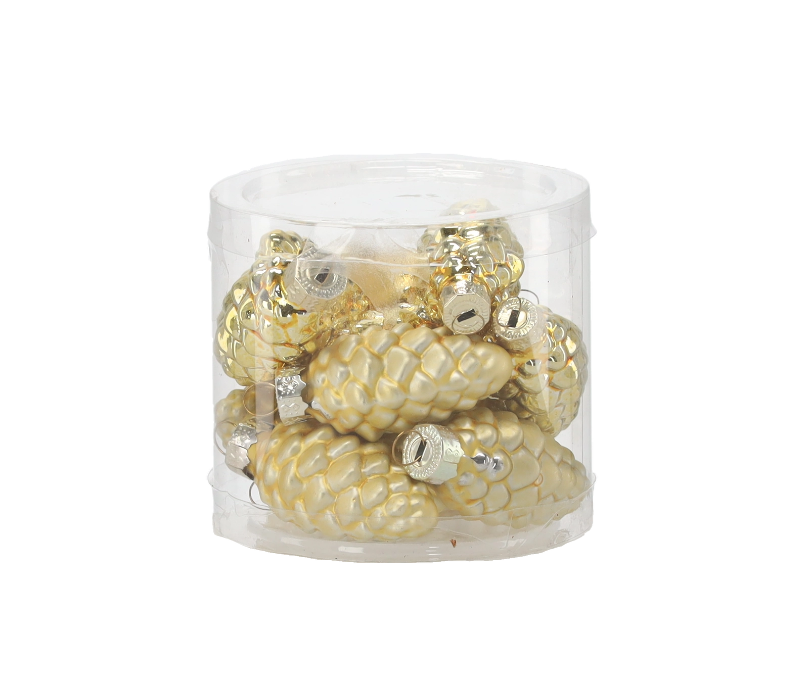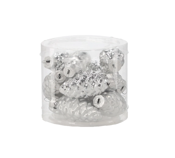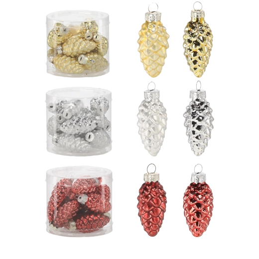 Creëer thuis een betoverende feestelijke sfeer met een set van 12 glazen ornamenten in de vorm van dennenappels. Elke dennenappel met afmetingen ca. 2,7 × 5,9 cm is zorgvuldig gevormd voor een authentieke, natuurlijke uitstraling. De combinatie van glanzende en matte afwerkingen in verschillende kleuren geeft de boom elegante schittering en diepte in lichtreflecties.