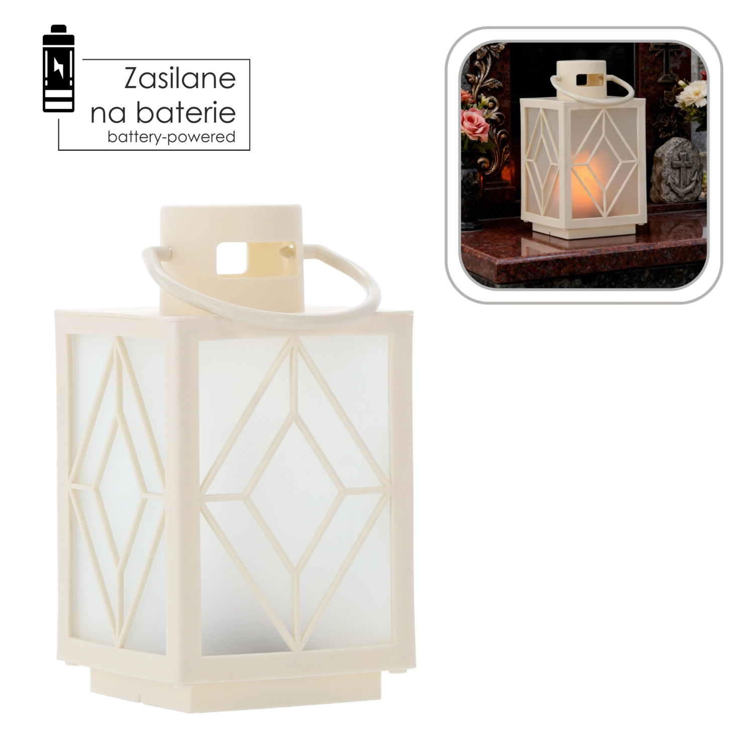 Dankzij de batterijvoeding is de lantaarn volledig draagbaar – je zet hem zo op een plank, terras of grafmonument. De stevige hendel maakt ophangen en snel verplaatsen eenvoudig.
