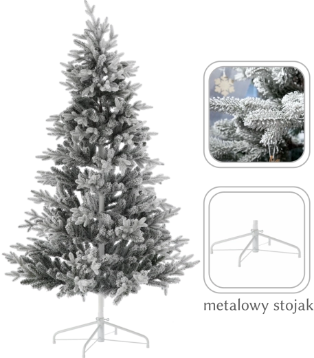 De synthetische kerstboom Agata met sneeuweffect biedt een authentieke winterse uitstraling zonder naaldrommel en zonder onderhoud. Groene takken met een dun laagje “sneeuw” creëren een feestelijke sfeer in elk interieur – van woningen tot kantoren en commerciële ruimtes.