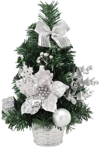 Het boompje is voorgedecoreerd met zilveren ballen, strikken en accessoires, dus je hoeft het alleen maar neer te zetten. De stabiele bloempot is onderdeel van de set, waardoor de decoratie stevig staat op diverse oppervlakken. Kwalitatieve materialen – plastic, draad en textiel – garanderen een lange levensduur en duurzaamheid, zodat het boompje vele seizoenen plezier geeft.