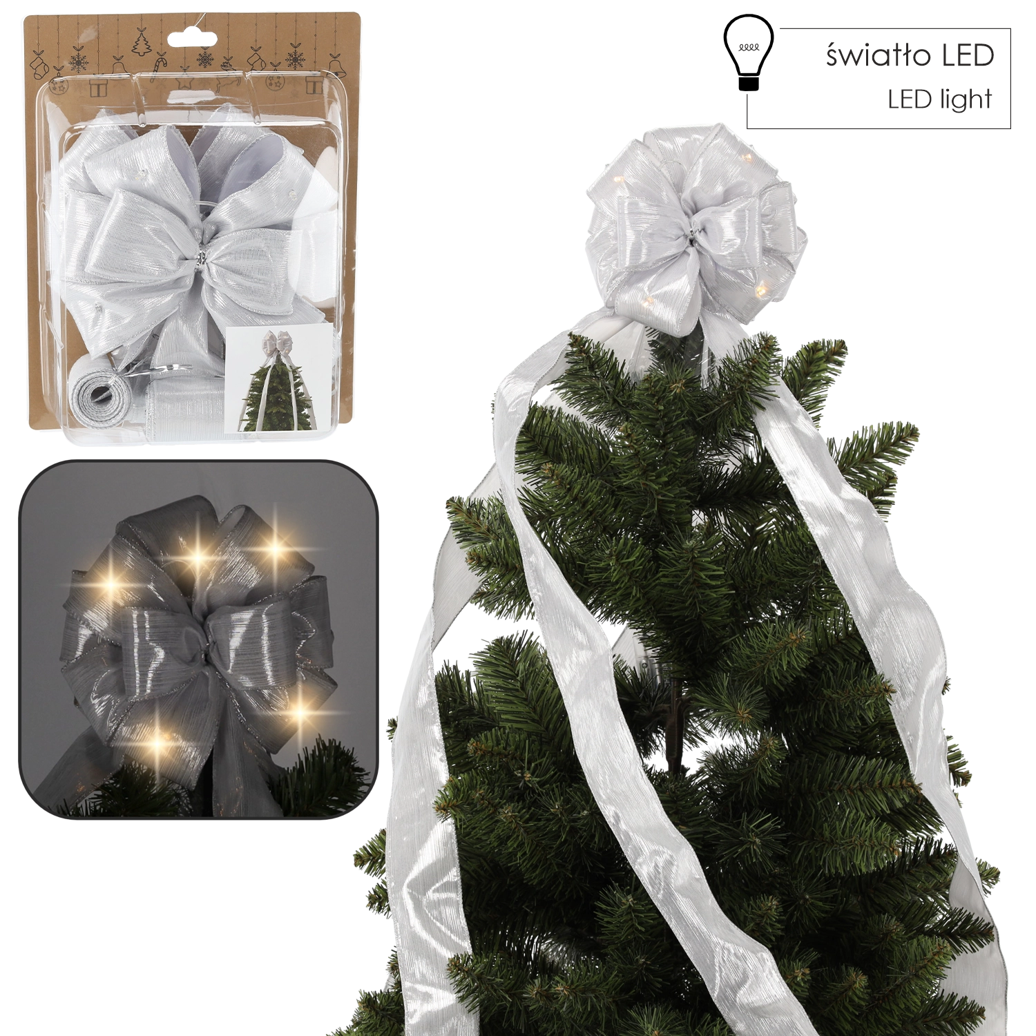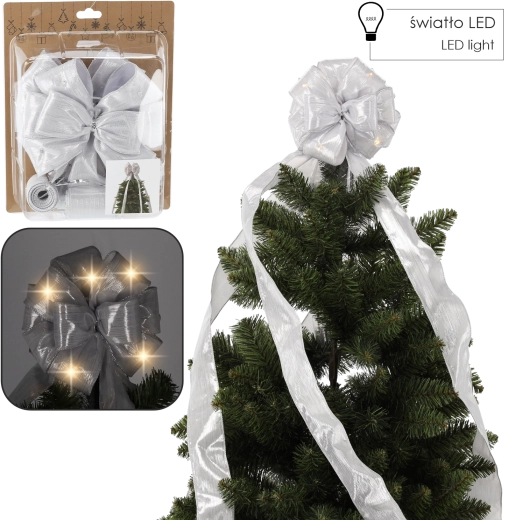 Elegante zilveren strik met LED-lichtjes en lange linten van 1,8 m die de piek van de kerstboom prachtig accentueren. Lichtgewicht constructie voor eenvoudige installatie, veilige werking met laag voltage en een voldoende lange voedingskabel van 1,8 m zorgen voor een comfortabele en efficiënte oplossing voor moderne feestelijke decoratie.
