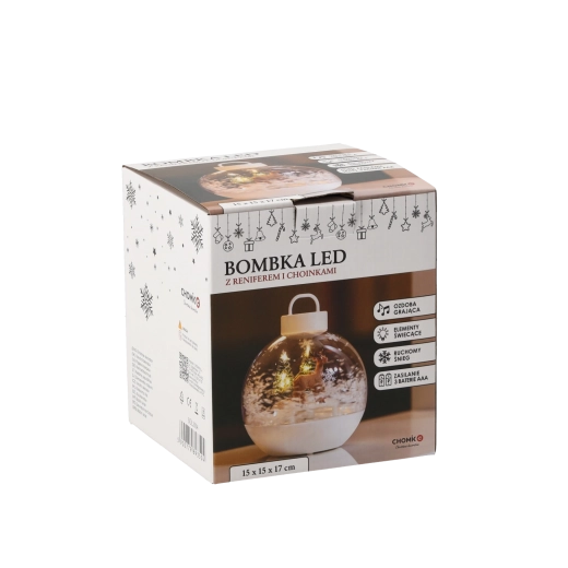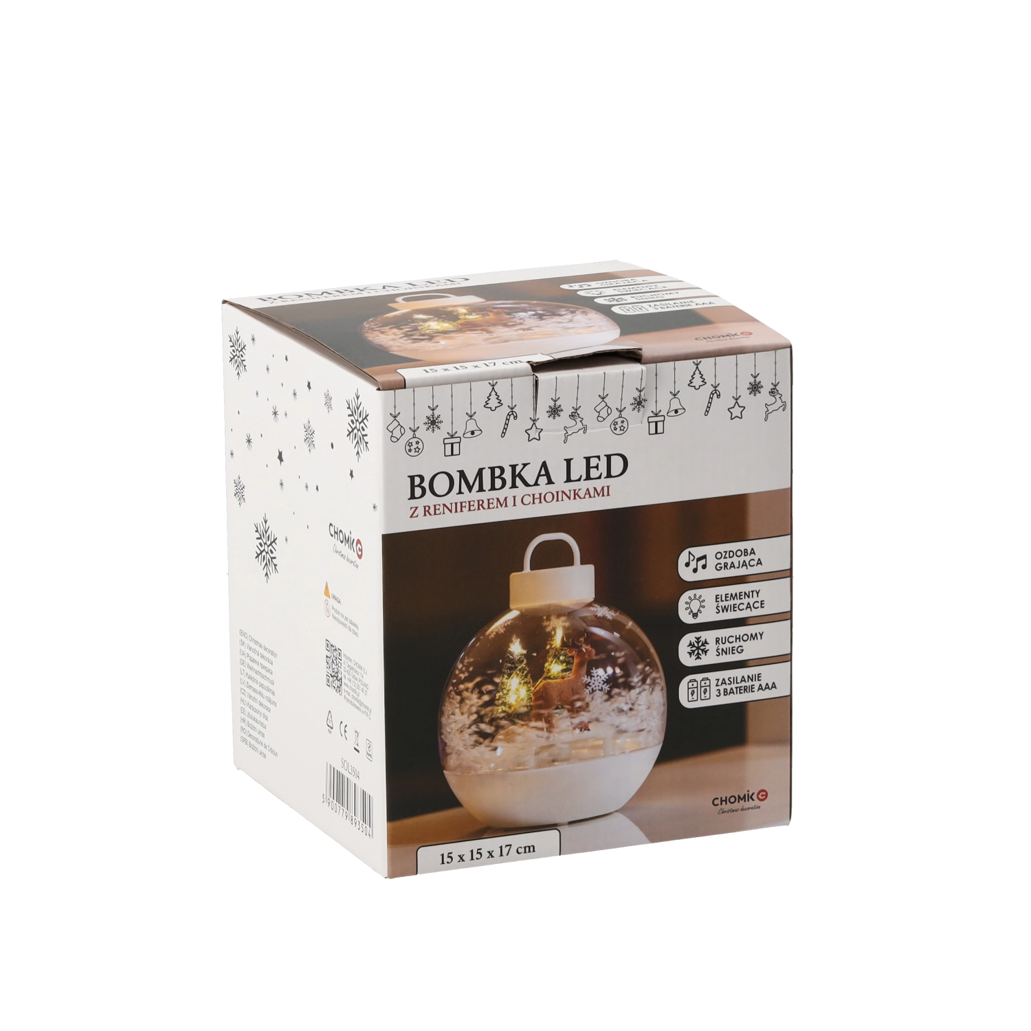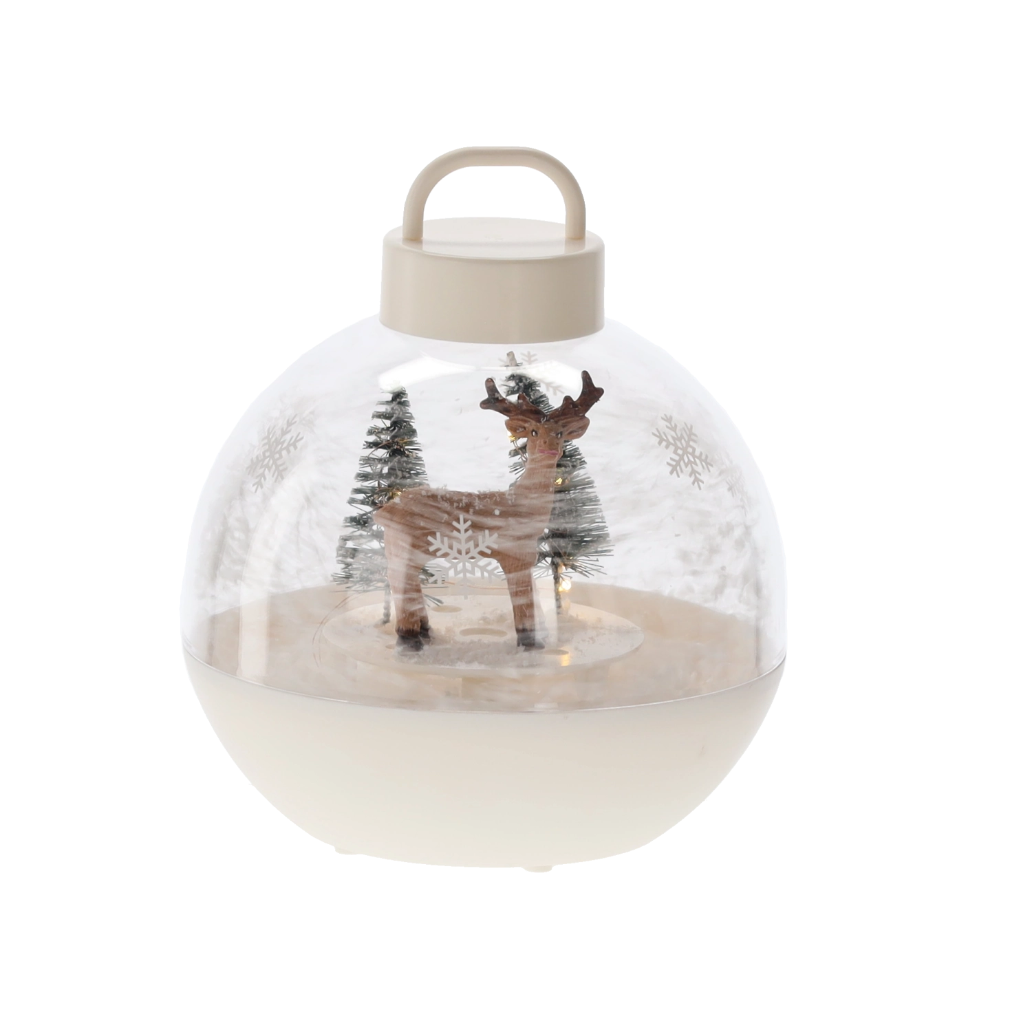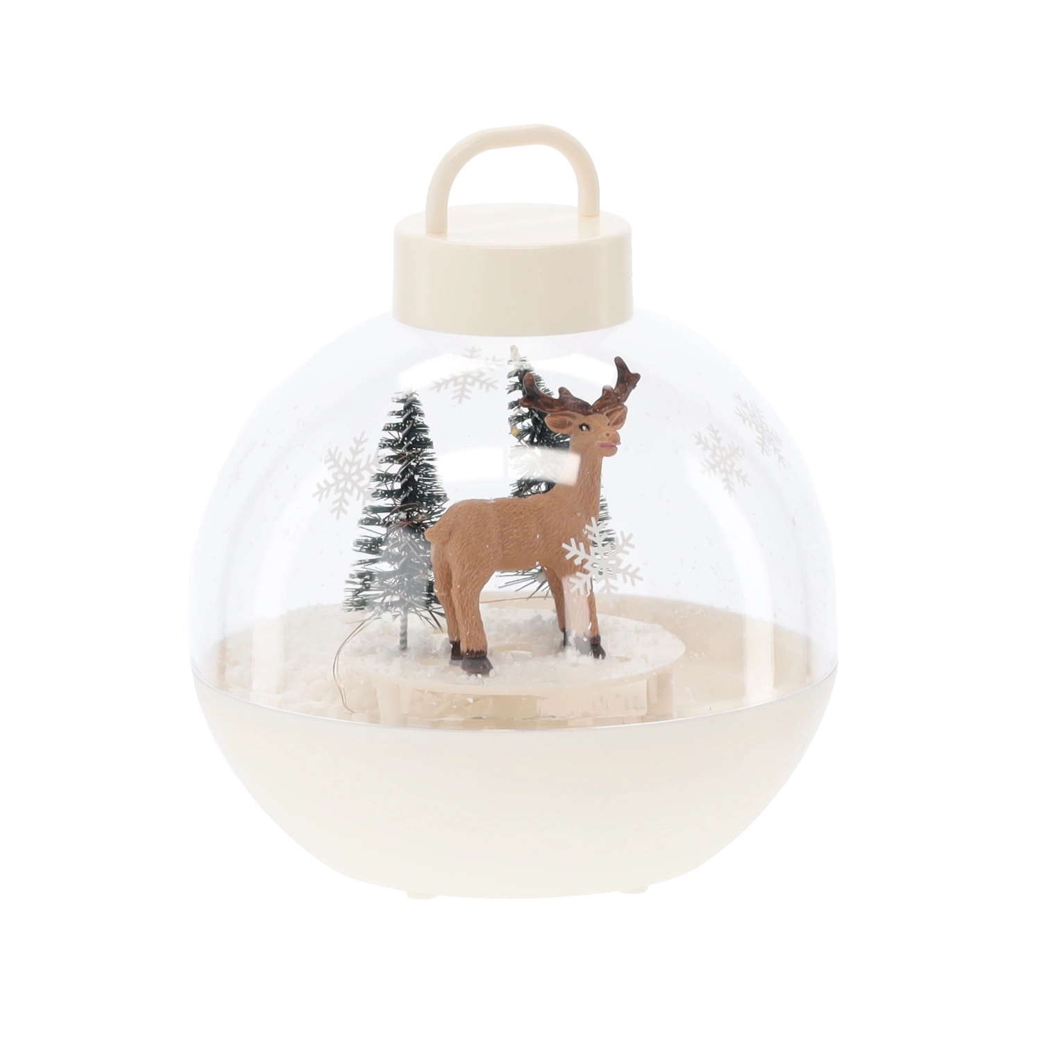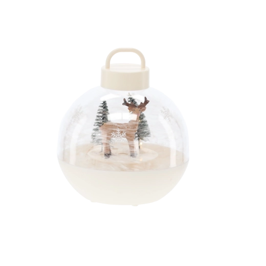 Breng feestelijke sfeer in huis met deze indrukwekkende decoratie in de vorm van een transparante bol met een crème/witte voet. Binnenin staat een gedetailleerde rendier met winterse boompjes, die onder het warme witte LED-licht een knus tafereel vormen. De decoratie biedt ook een muziekmechanisme met 8 liedjes en een effect van vallende sneeuw.