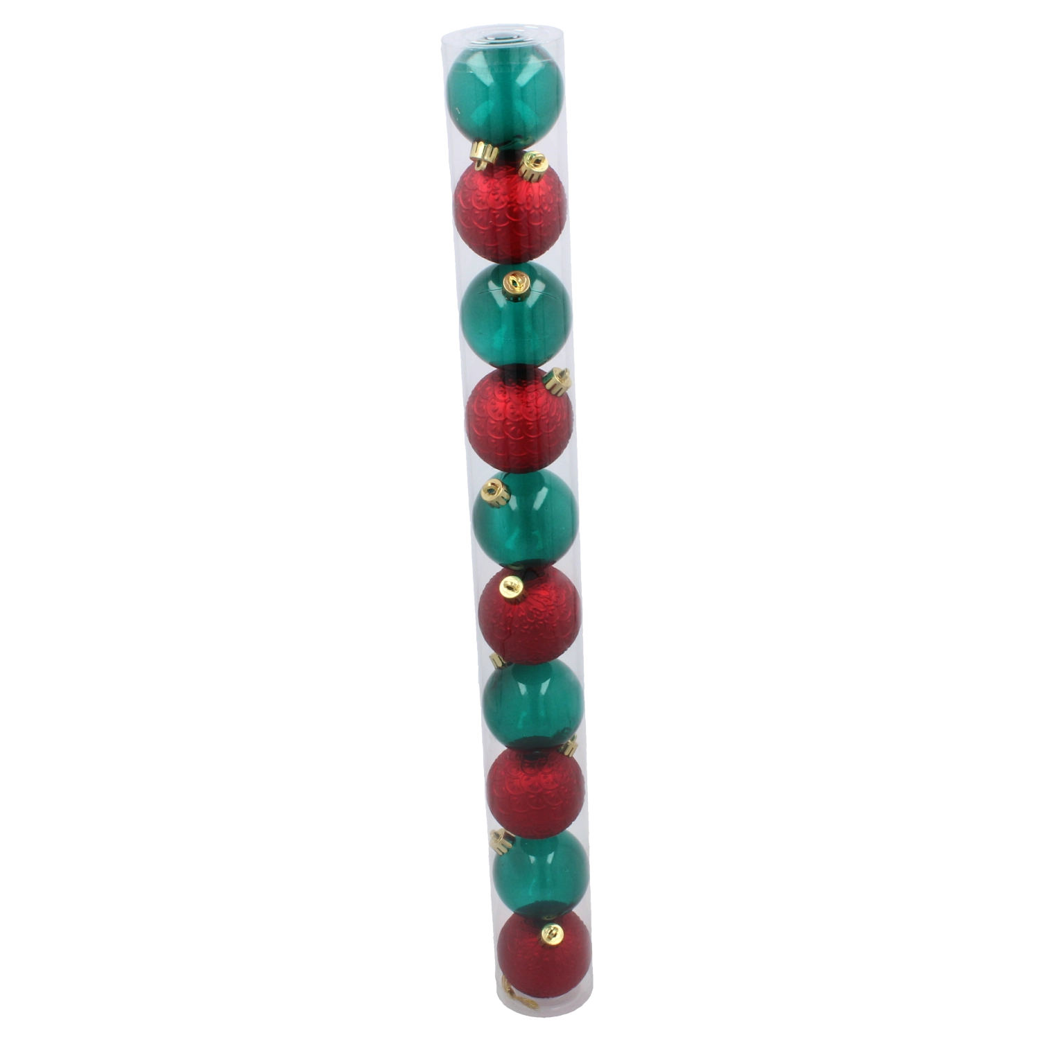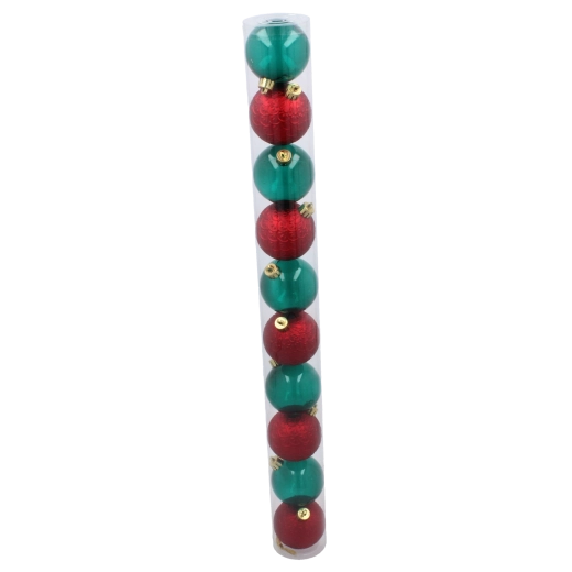 Elegante set van tien kerstballen met een diameter van 6 cm in de combinatie van rood en flesgroen, die je boom een traditionele charme geeft. Gemaakt van breukbestendig materiaal en met een mix van glanzende en matte afwerkingen die het licht prachtig weerkaatsen en zorgen voor een lange levensduur. De praktische verpakking in een transparante koker maakt opbergen en vervoeren eenvoudig.