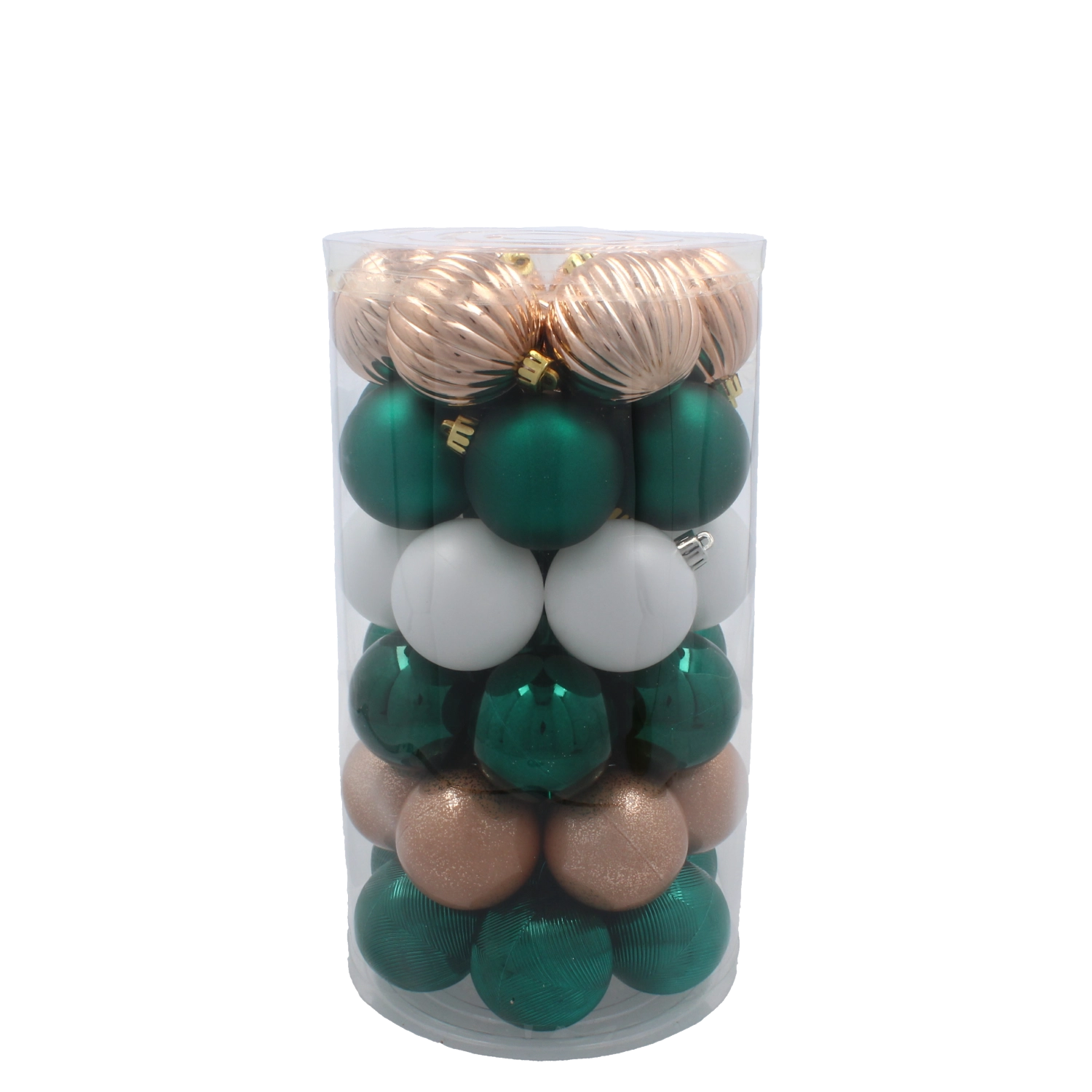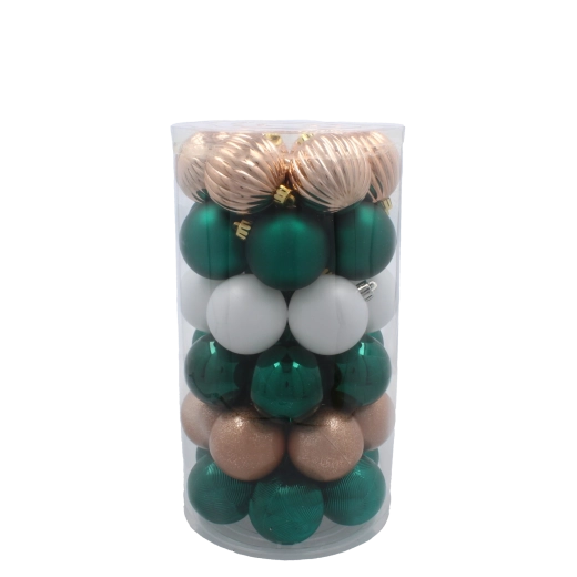 Geef uw huis een elegante feestelijke touch. Deze complete set kerstballen in trendkleuren combineert zacht champagne, klassiek groen en helder wit voor een perfect uitgebalanceerde look. Verschillende afwerkingen – glans, mat, ribbel en subtiele glitter – creëren diepte en reflecties die de magie van Kerst onderstrepen.