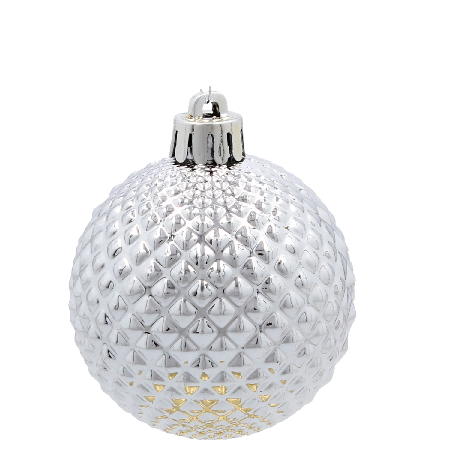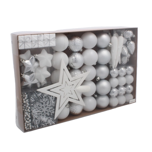 Deze veelzijdige set versieringen in wit en zilver past uitstekend bij zowel klassieke als moderne decors. De mix van afwerkingen – mat, glans, glitter en gefacetteerde structuren – zorgt voor prachtige lichtreflecties en visuele diepte. Met 60 stuks versier je moeiteloos de hele boom en extra decoraties.