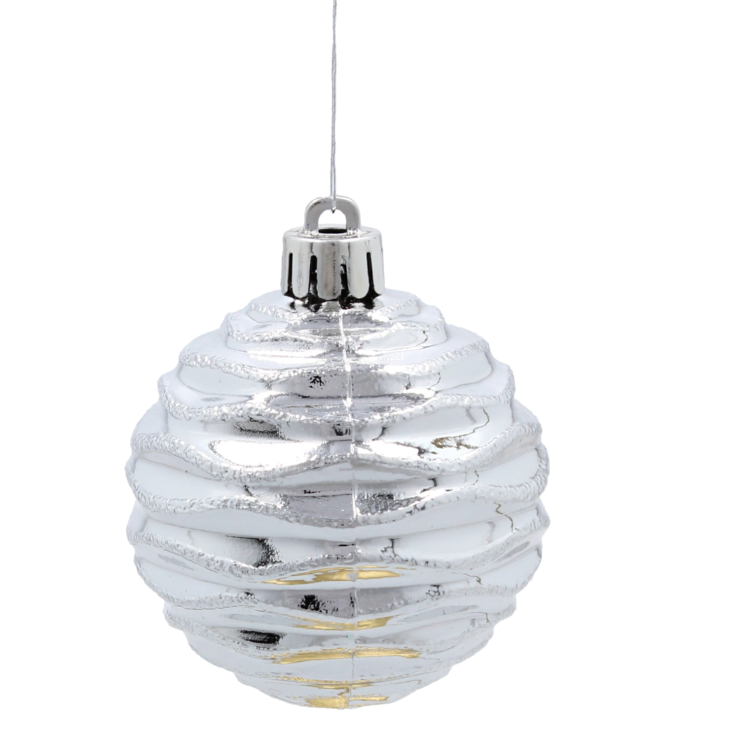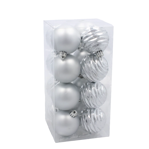De afwisseling van gladde, matte en geribbelde effecten geeft de ornamenten diepte en weerkaatst prachtig het licht van de kerstverlichting.