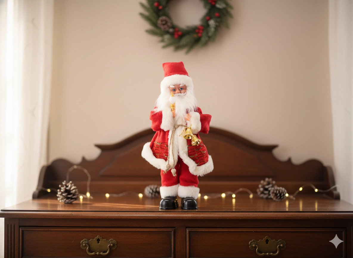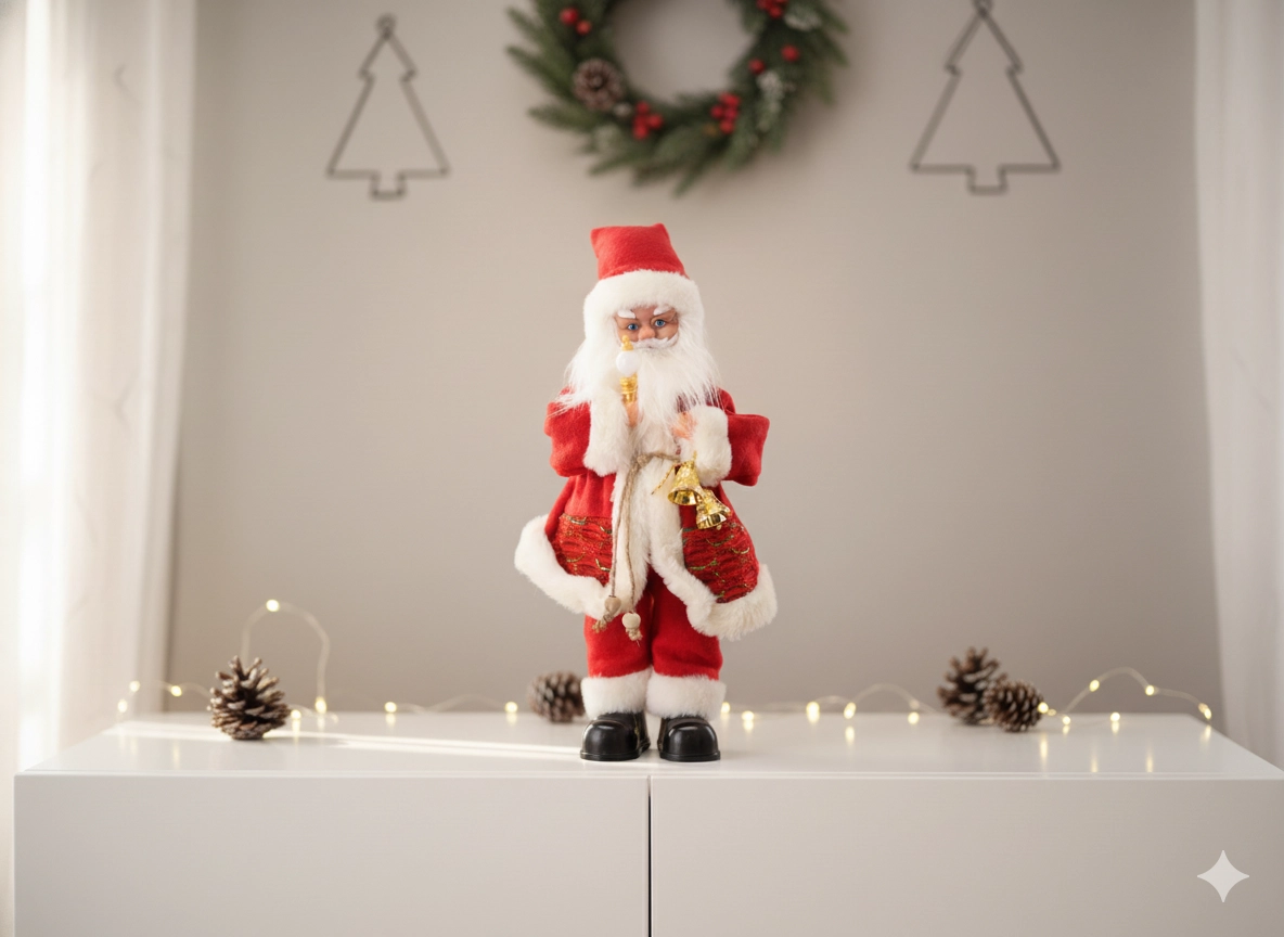 Deze elegante kerstdecoratie combineert het traditionele SANTA-thema met moderne elementen – LED-verlichting en een muziekfunctie. Rijke details, een zachte outfit en accessoires zoals een kaars of belletje geven je interieur een warme, feestelijke uitstraling.