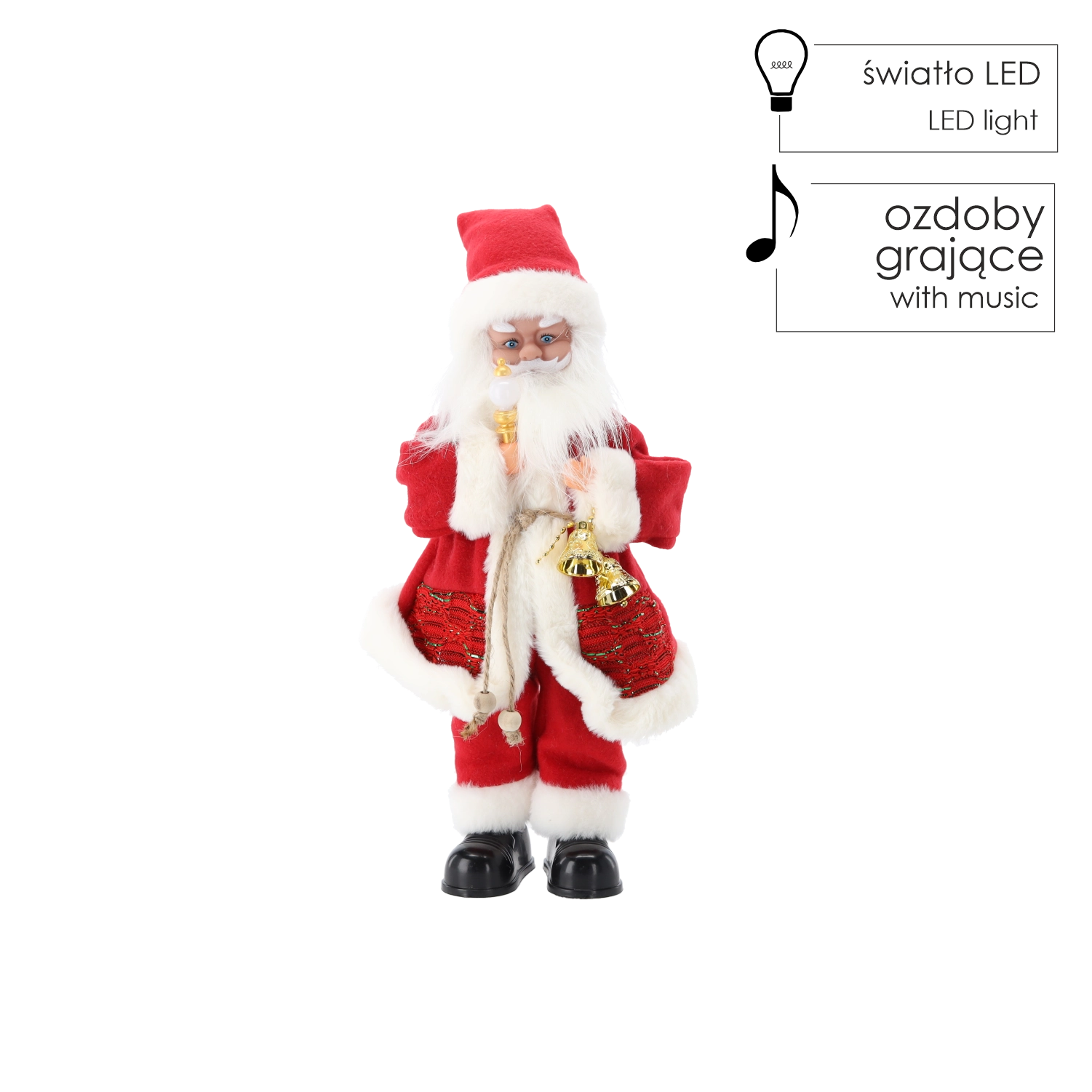 Breng een betoverende kerstsfeer in huis met de decoratieve SANTA-figuur met kaars, die warm LED-licht uitstraalt en kerstmelodieën afspeelt. Dankzij de hoogte van 40,5 cm, het realistische design en de mogelijkheid om vrij neer te zetten, wordt hij het middelpunt van je feestelijke decoratie in de woonkamer, kinderkamer of op kantoor.