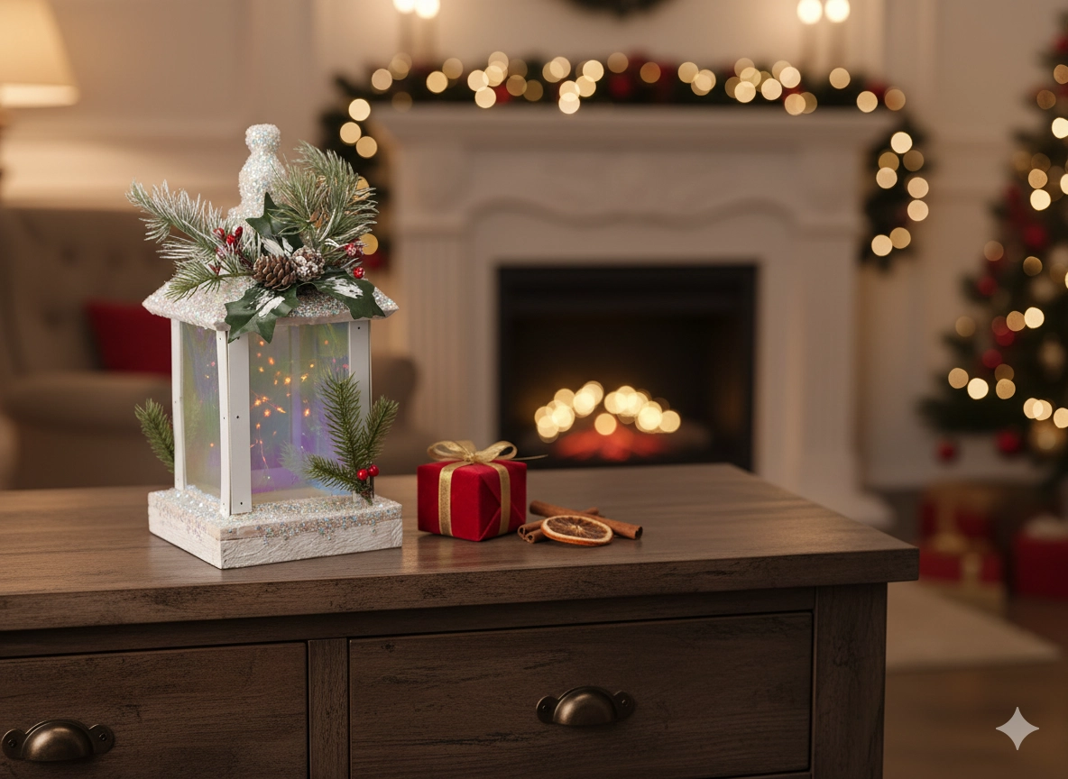 Breng een magische kerstsfeer in huis met deze elegante witte LED-lampion. Hij biedt warm, subtiel flikkerend licht dat het vlammetje van een kaars nabootst, veilig gebruik zonder open vuur en stijlvolle winterdecoratie met dennenappels, takjes en rode besjes. Dankzij de batterijvoeding plaats je hem eenvoudig op een dressoir, tafel of vensterbank.