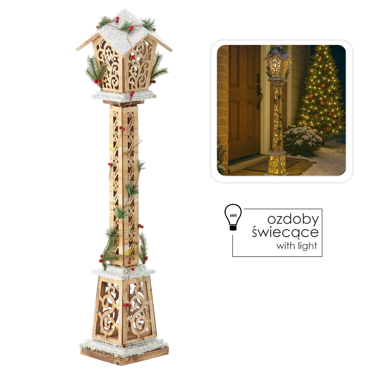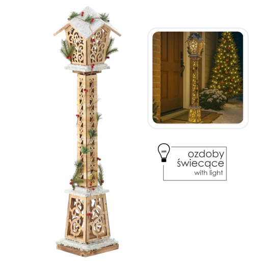 Deze hoge houten lantaarn in een bruine tint creëert dankzij de geïntegreerde LED’s een aangenaam warm licht dat prachtig door de decoratieve uitsnijdingen schijnt. Realistische twijgjes, bessen en sneeuwdetails benadrukken de winterse en feestelijke uitstraling, ideaal bij de deur, op de veranda, in de woonkamer of naast de kerstboom.