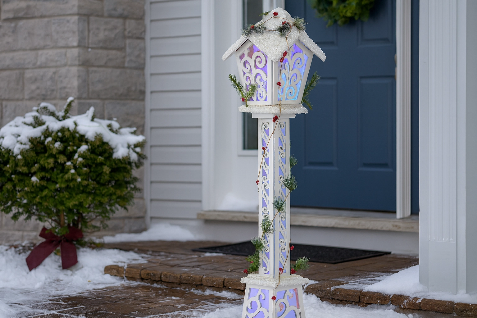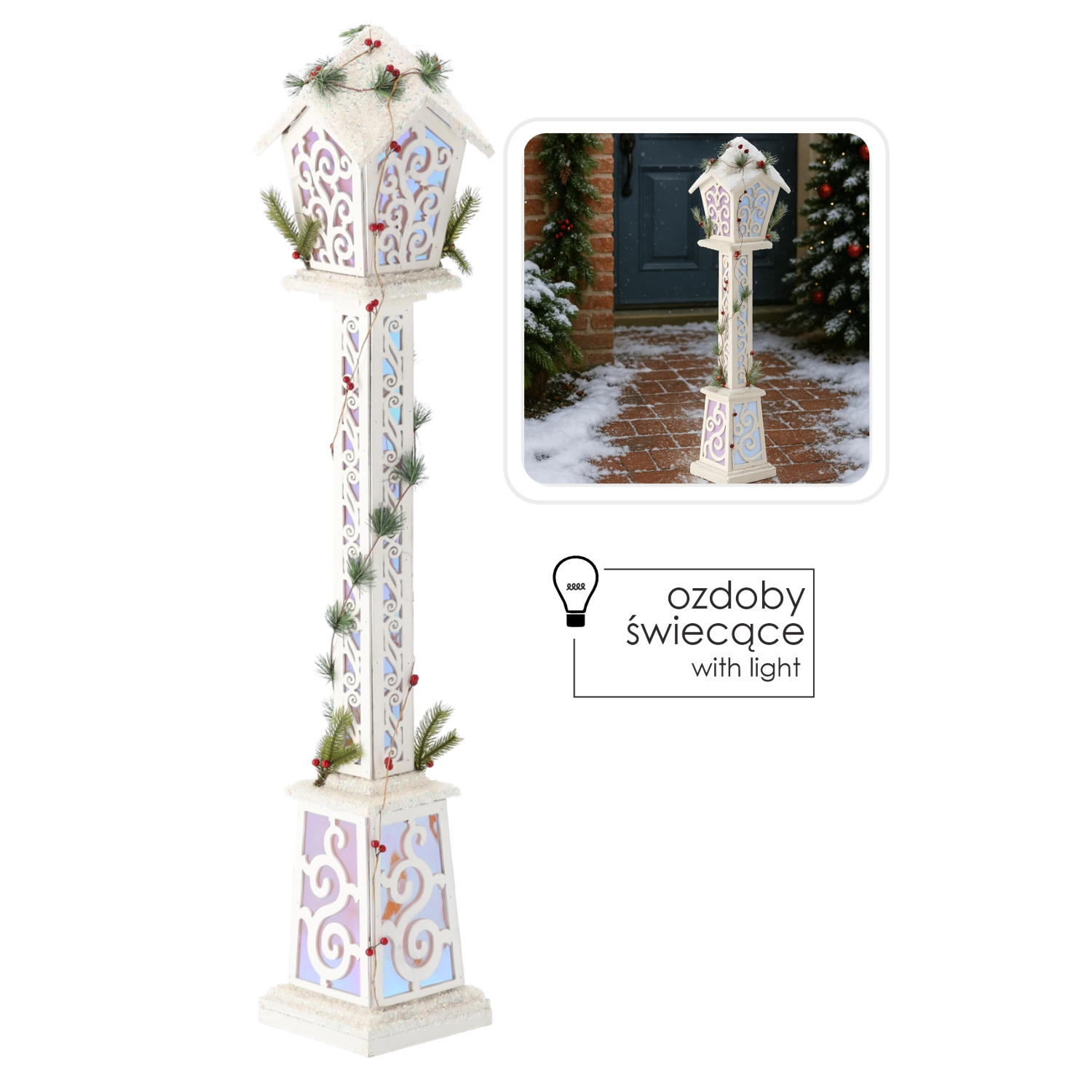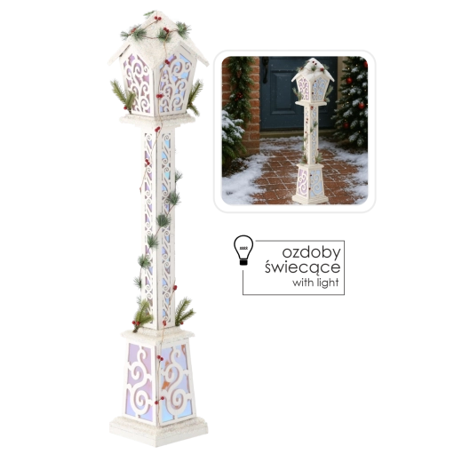 Deze hoge kerstlantaarn valt op door het strakke witte design en subtiel verlichte, ornamentale panelen die, eenmaal ingeschakeld, een speels lichtspel creëren. Dankzij LED‑technologie brandt ze zuinig en veilig, zonder op te warmen en met een lange levensduur.