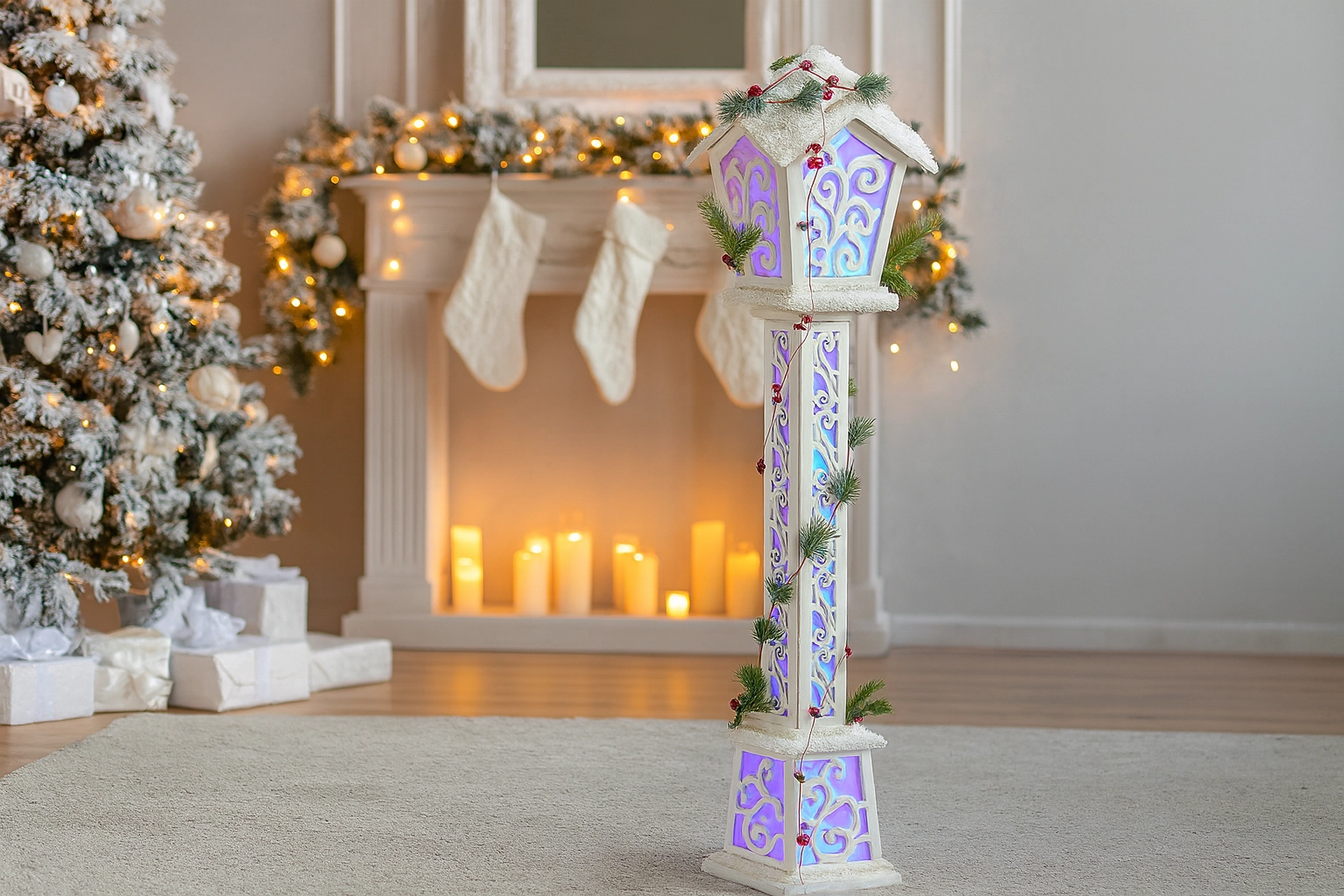 De witte lantaarn met uitsparingen, kunstgroen en rode bessen past bij zowel moderne als klassieke stijlen en geeft elke ruimte een feestelijke touch.