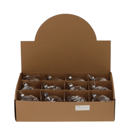 Deze glazen bal in heldere uitvoering is een universele decoratie die prachtig uitkomt in de kerstboom en in andere feestelijke arrangementen. Het transparante design met verschillende patronen laat licht door en creëert zachte reflecties die de magische kerstsfeer benadrukken.