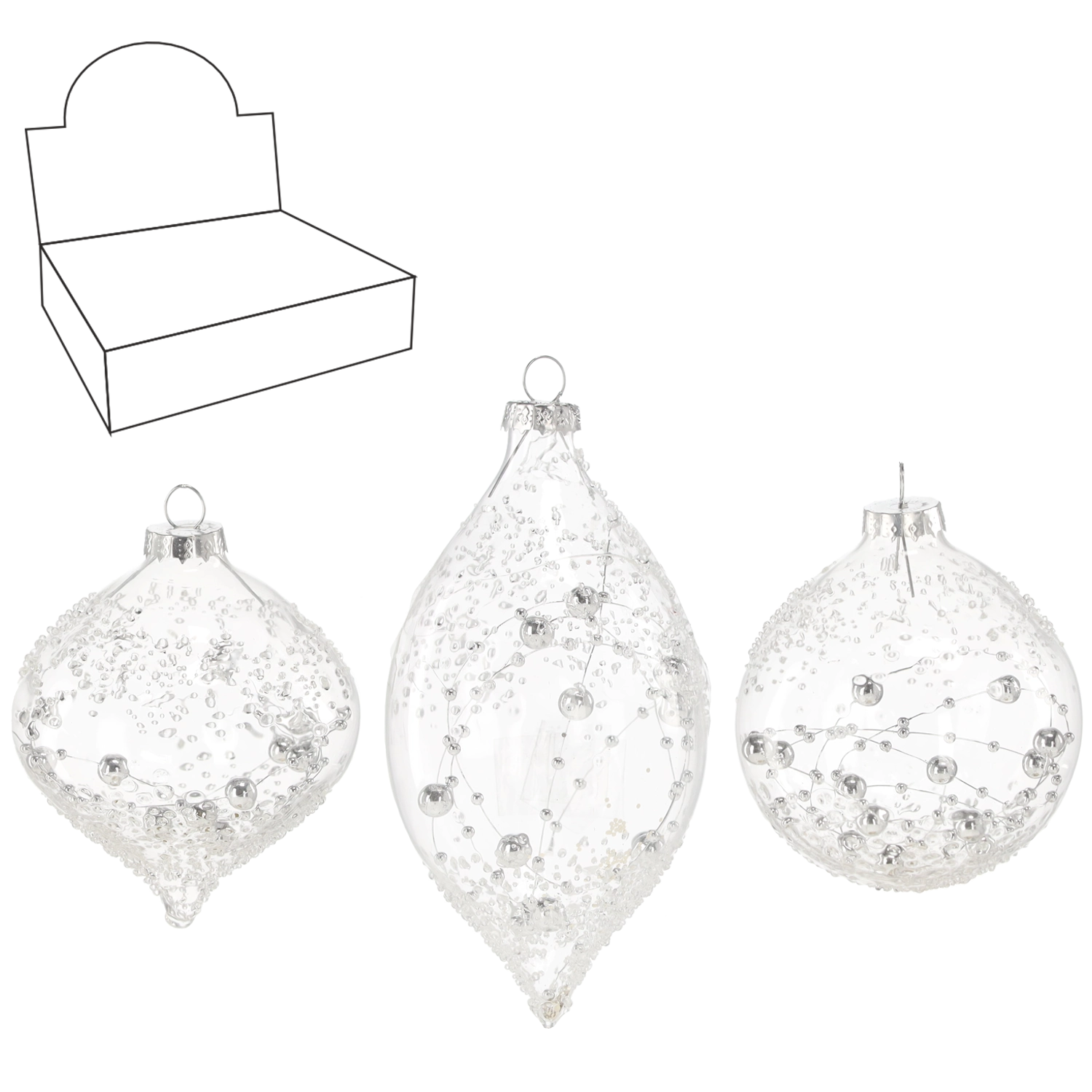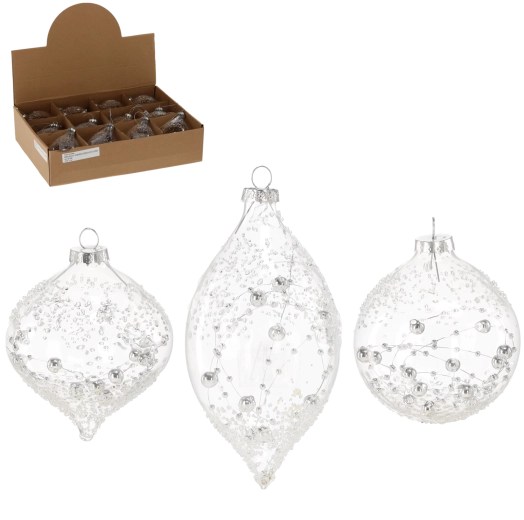 Verfijn je kerstboom en seizoensarrangementen met transparante glazen ballen in een mix van patronen. Transparant glas weerkaatst het licht prachtig, waardoor de ornamenten in elk interieur zacht en elegant ogen. De combinatie van ronde en langwerpige vormen zorgt voor visuele variatie en maakt het gemakkelijk te combineren met andere decoraties.
