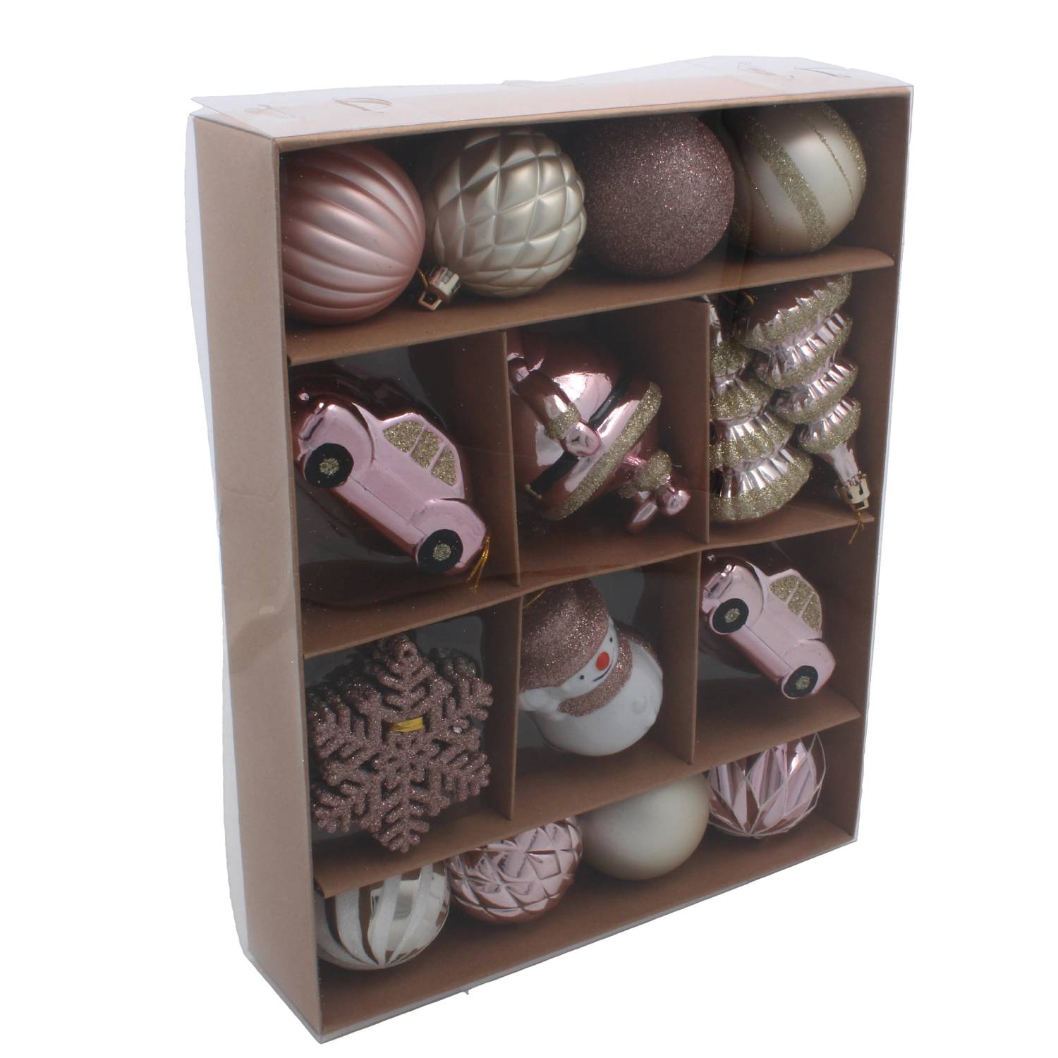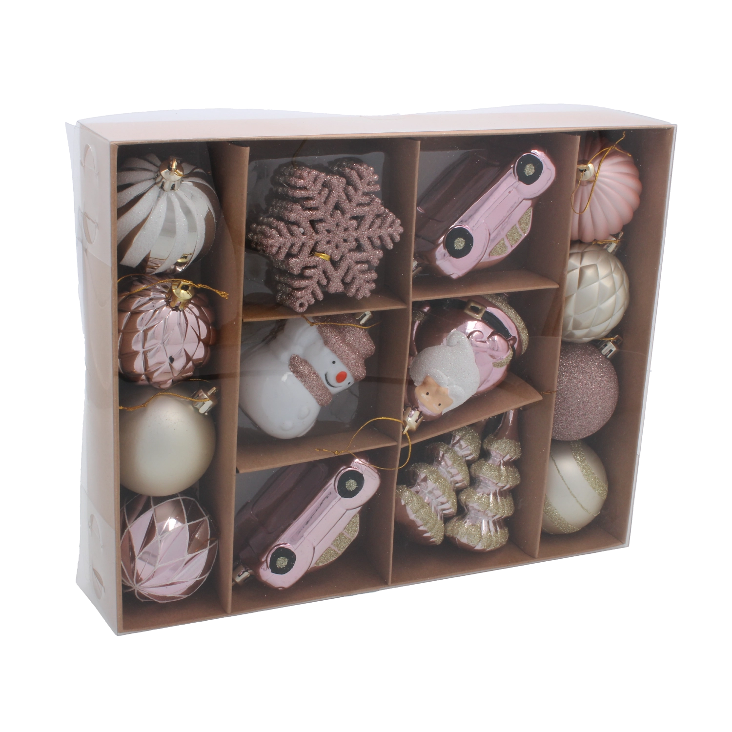 De set bevat zorgvuldig geselecteerde ornamenten met diverse afwerkingen en vormen die je boom diepte en glans geven. Roze en blauwe tonen passen perfect in moderne, Scandinavische en klassieke interieurs en zijn eenvoudig te combineren met andere decoraties.