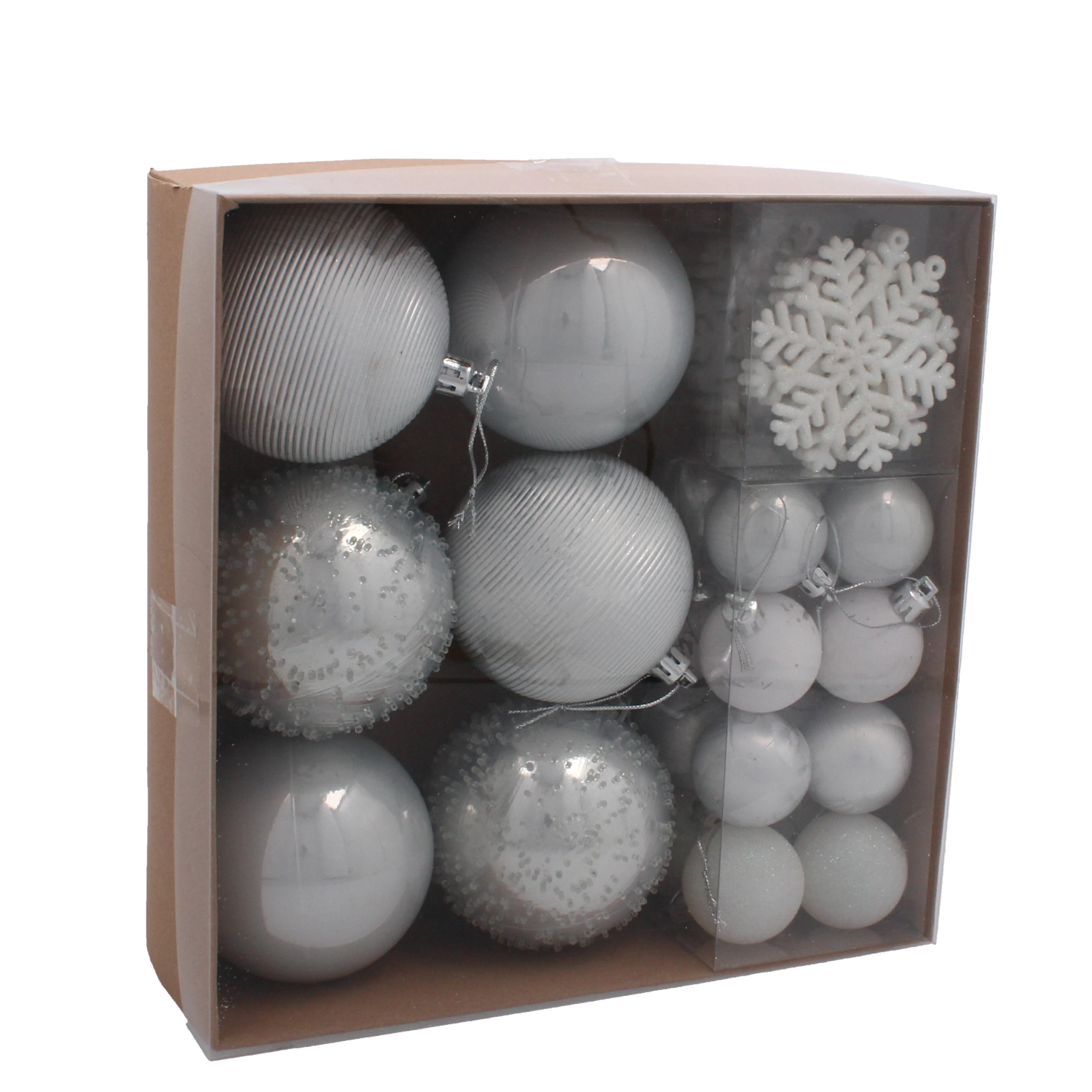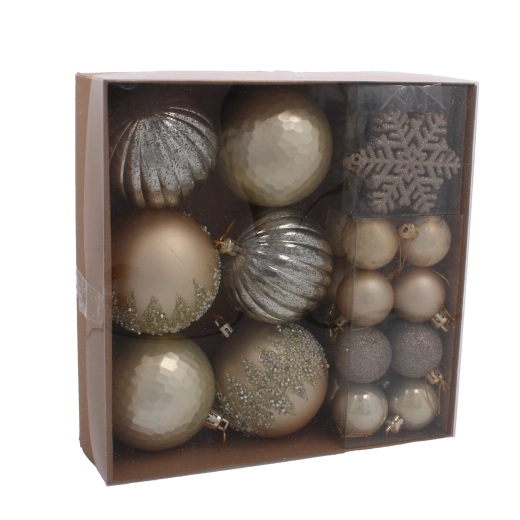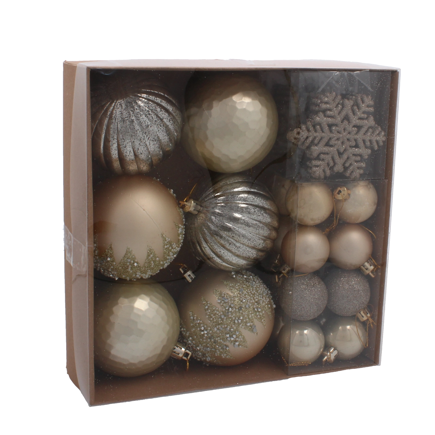 Deze uitgebalanceerde set van 30 ballen brengt een perfecte samensmelting van gouden en zilveren tinten die elke kerstboom laten stralen. Het lichte, duurzame en onbreekbare kunststof garandeert eenvoudig ophangen en veiligheid in huizen met kinderen en huisdieren. Dankzij de mix van gladde, glanzende, glitterende en reliëf afwerkingen krijgt je boom diepte, ritme en een frisse, luxe uitstraling.