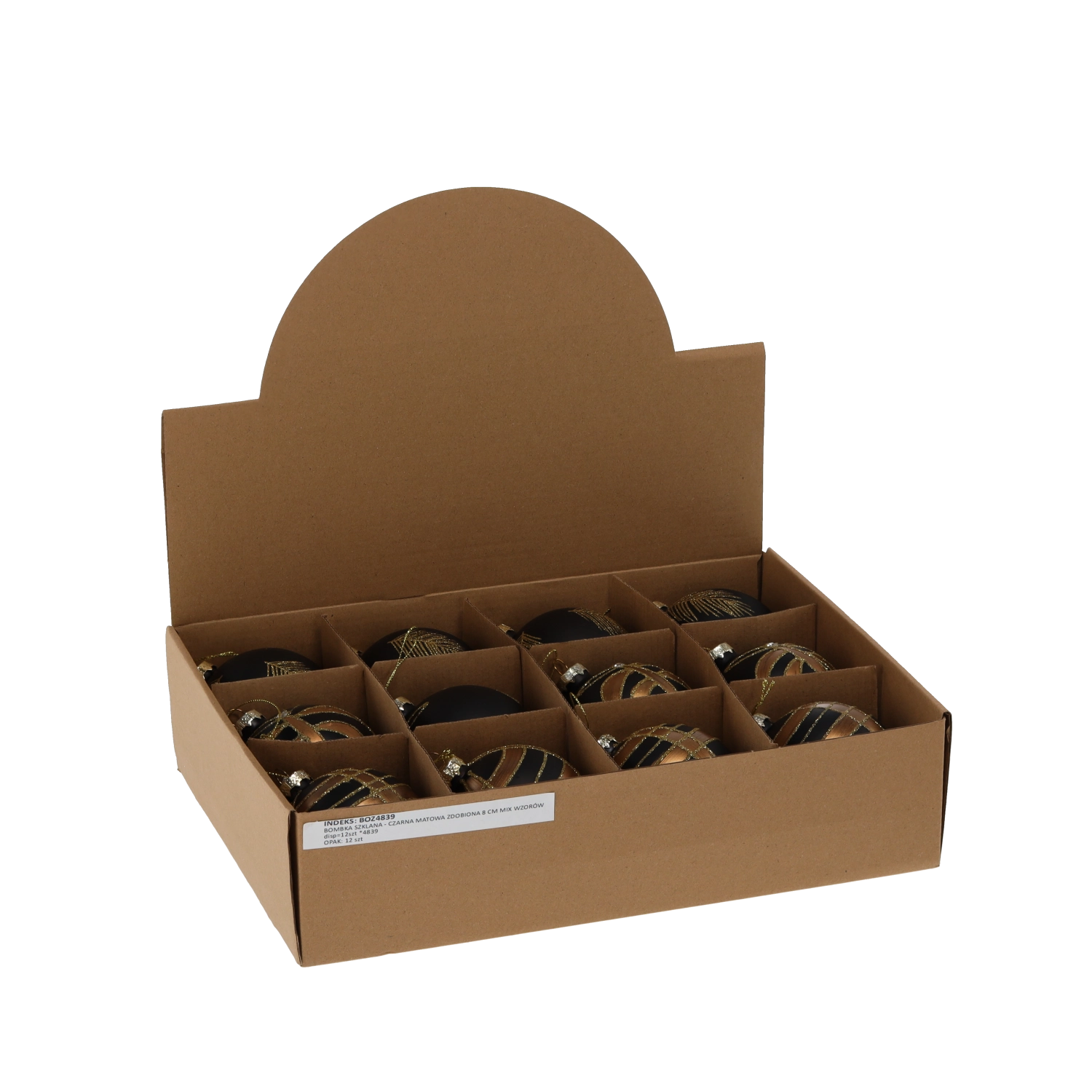 Elegante glazen kerstballen met een diameter van 8 cm in matzwarte kleur met gouden decoratie geven je boom een geavanceerde en moderne uitstraling. De set van 12 stuks met verschillende patronen zorgt voor een harmonisch contrast en brengt een warme, feestelijke glans in elk interieur.