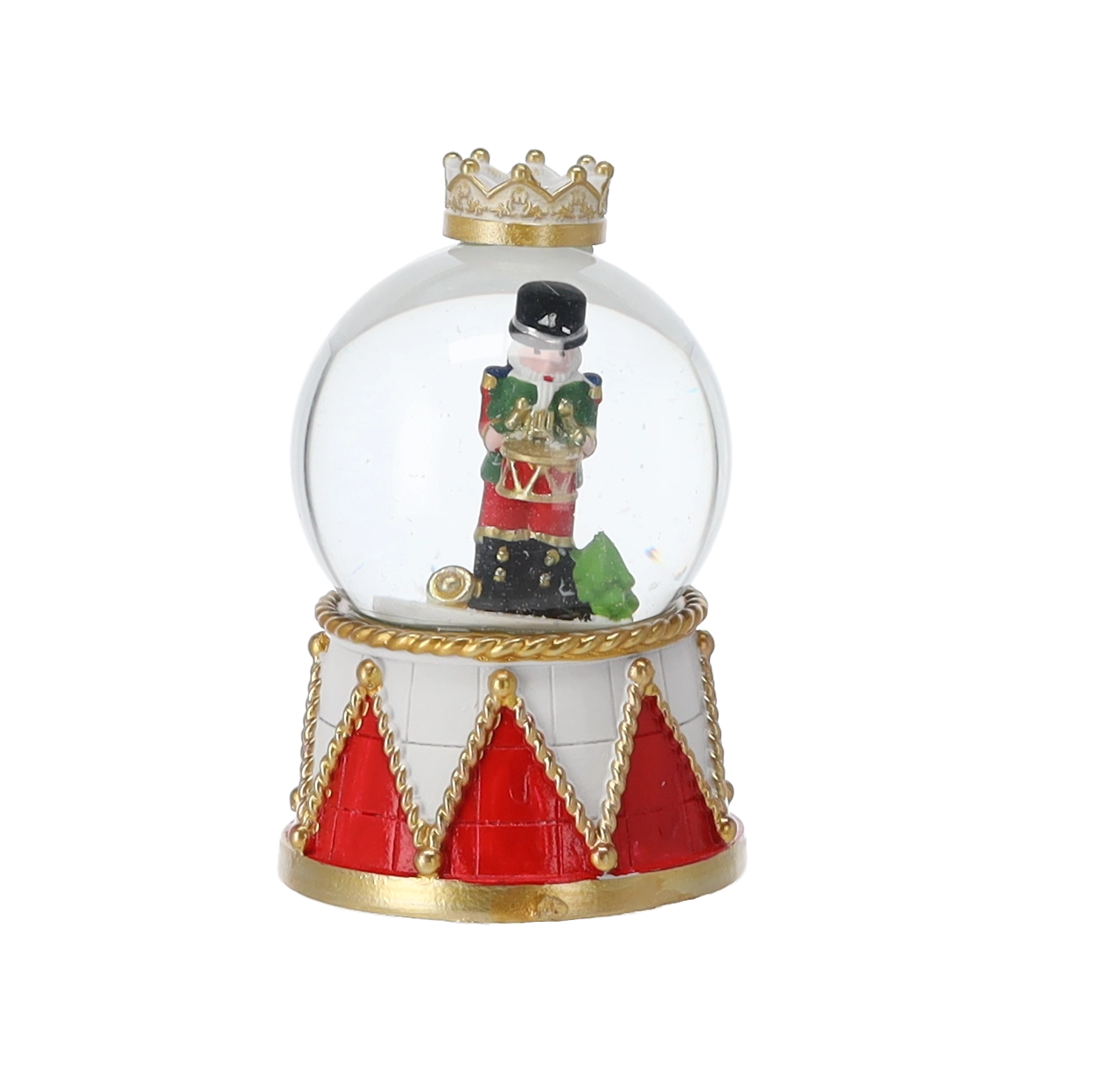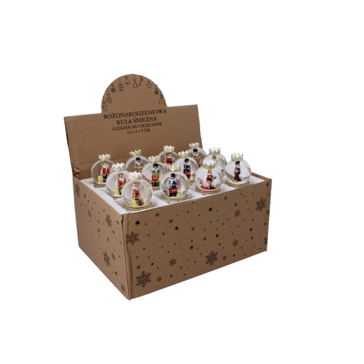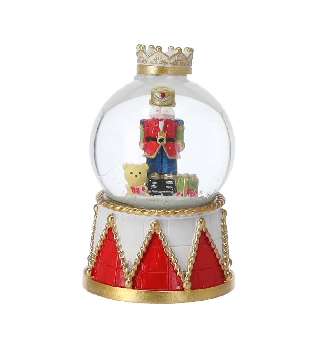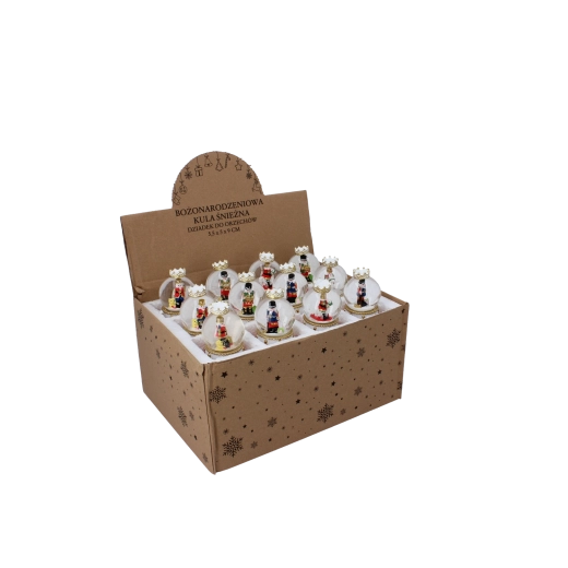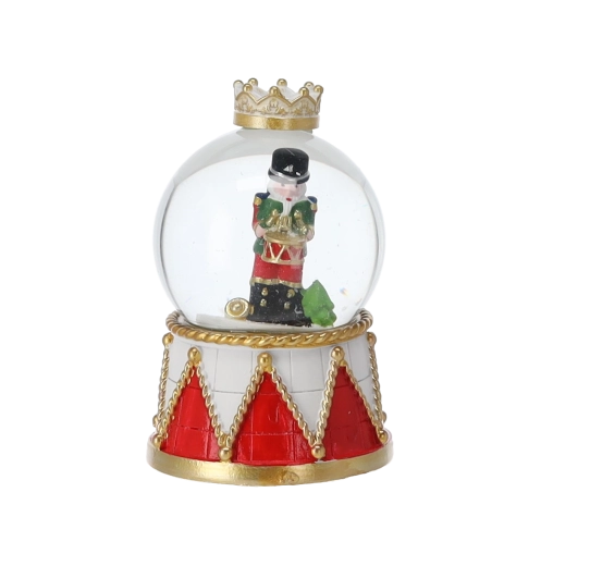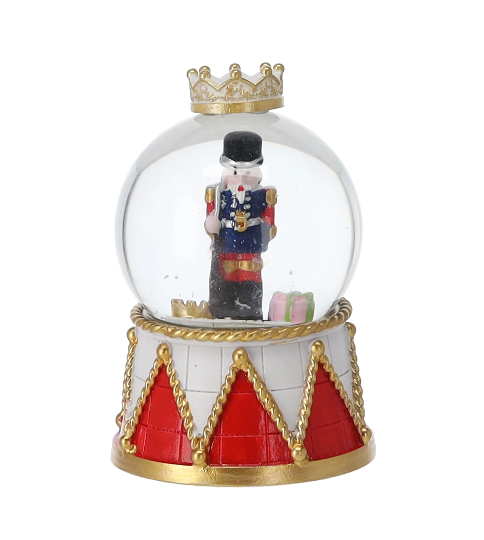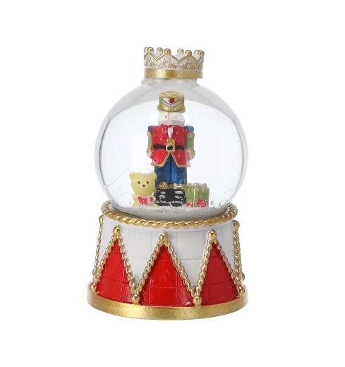 Elk stuk heeft een heldere glazen koepel en een decoratieve voet in rood-gouden trommelontwerp met kroon. Dankzij de compacte afmetingen past hij op een salontafel, plank of feesttafel. Met de mix van notenkrakermotieven stem je de bol eenvoudig af op andere versieringen.