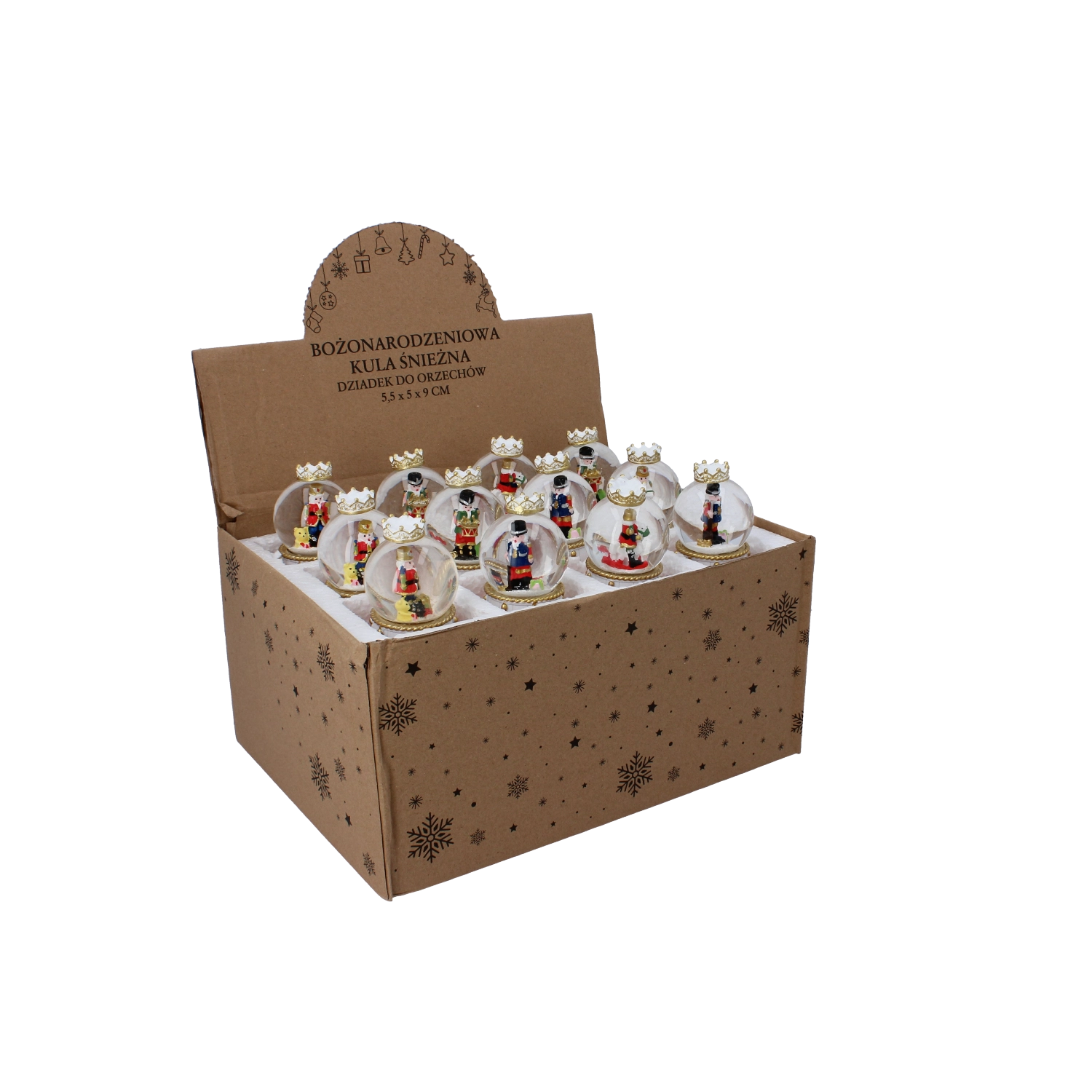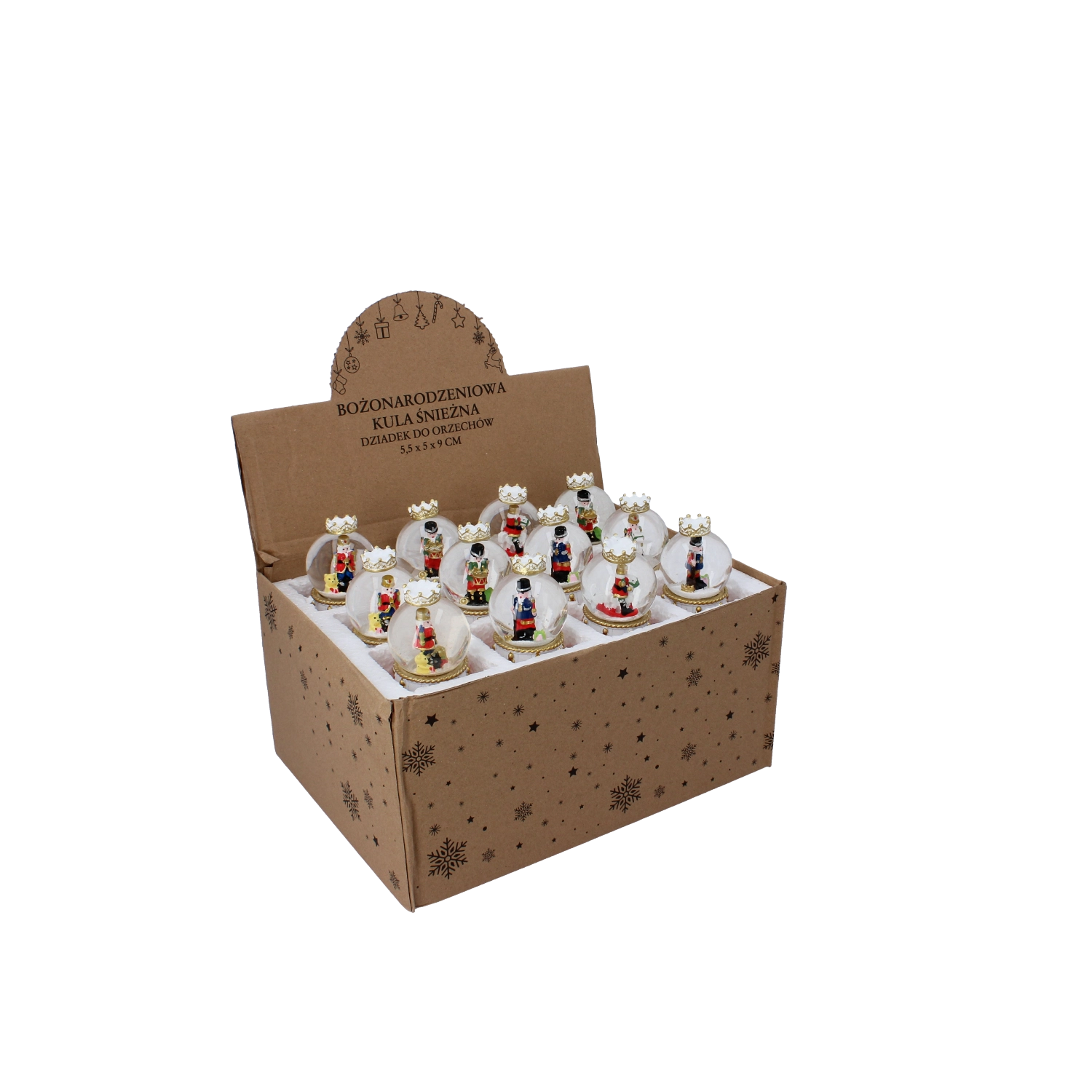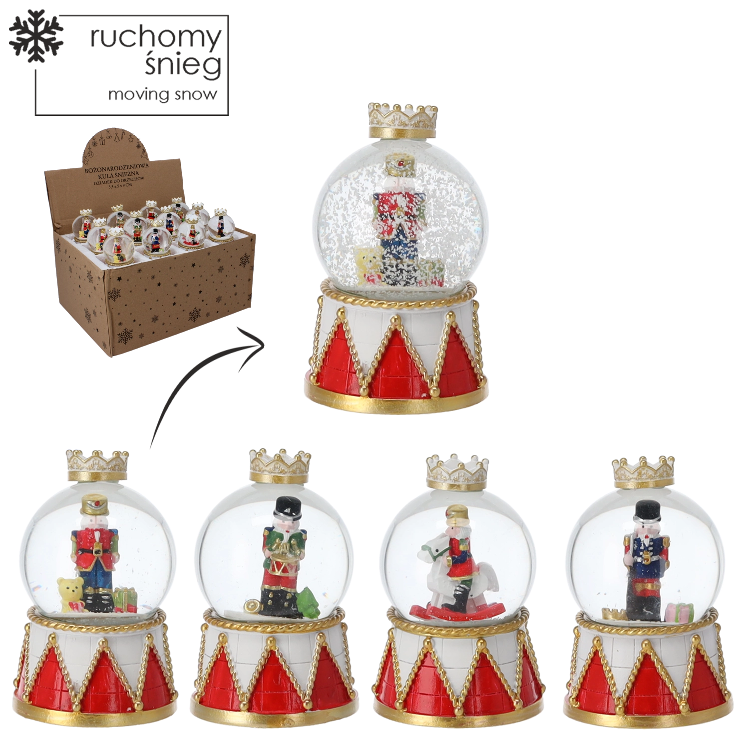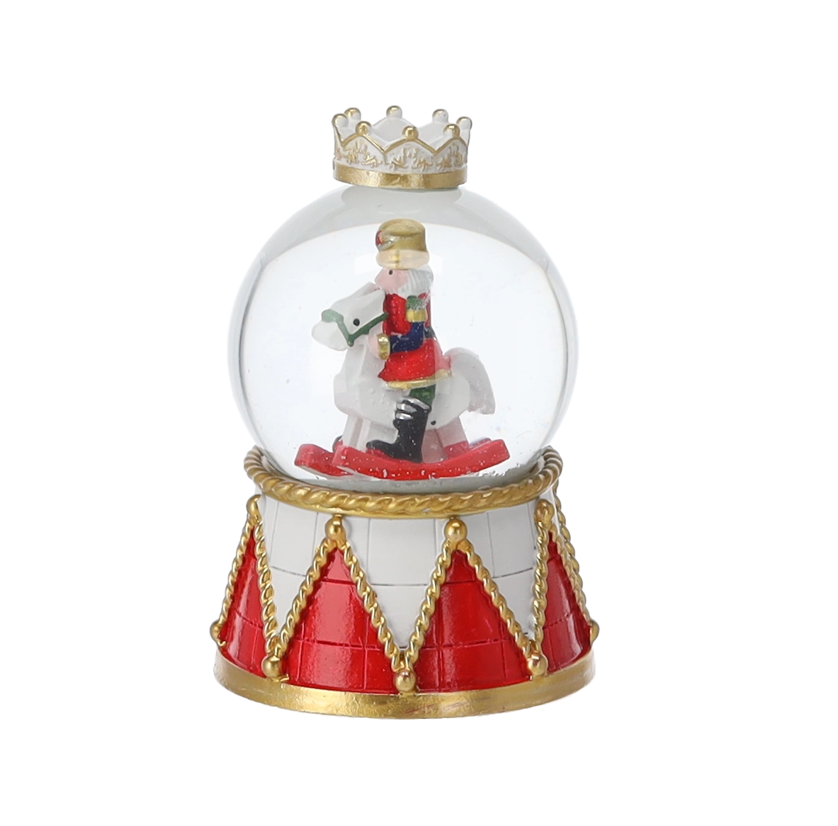 Elk stuk heeft een heldere glazen koepel en een decoratieve voet in rood-gouden trommelontwerp met kroon. Dankzij de compacte afmetingen past hij op een salontafel, plank of feesttafel. Met de mix van notenkrakermotieven stem je de bol eenvoudig af op andere versieringen.