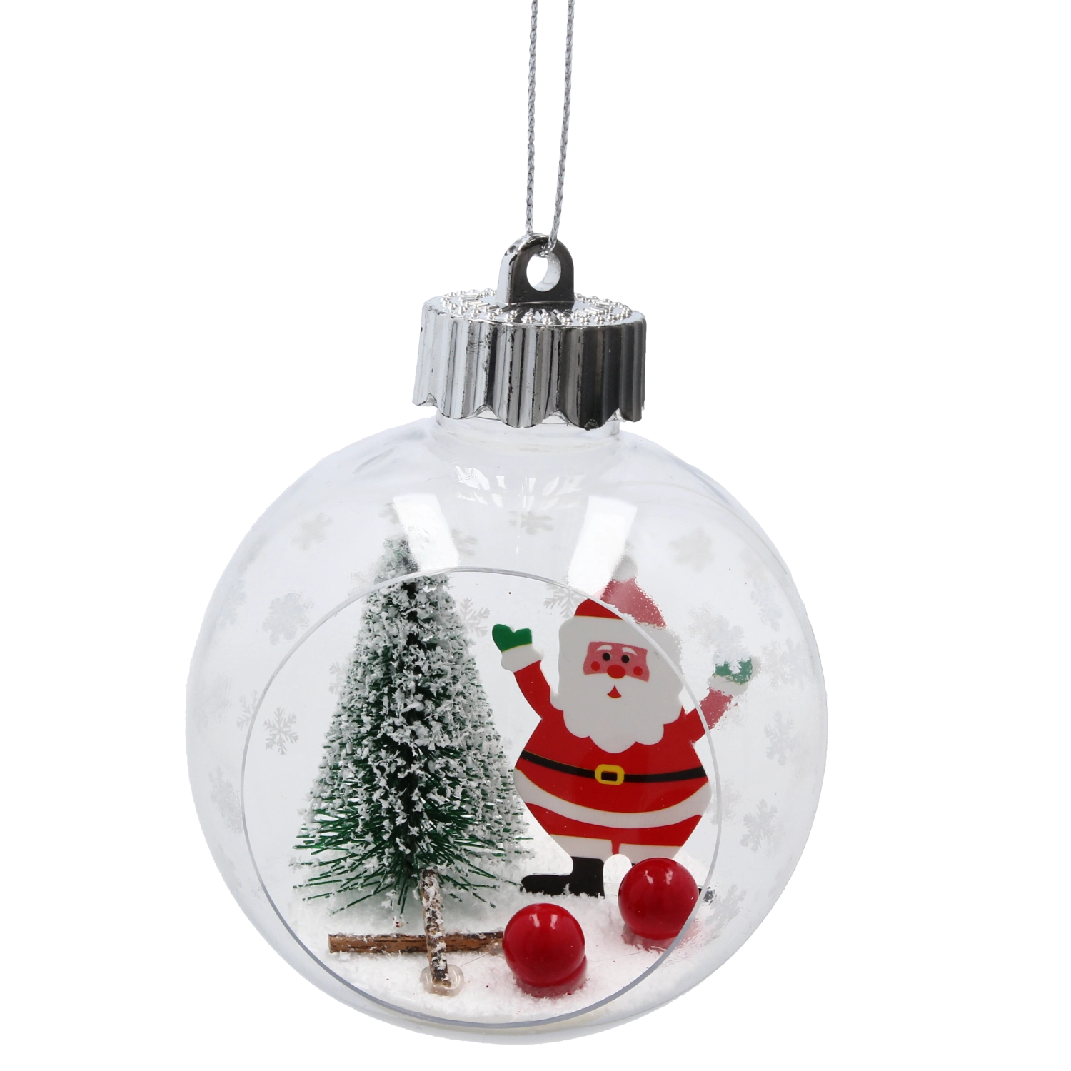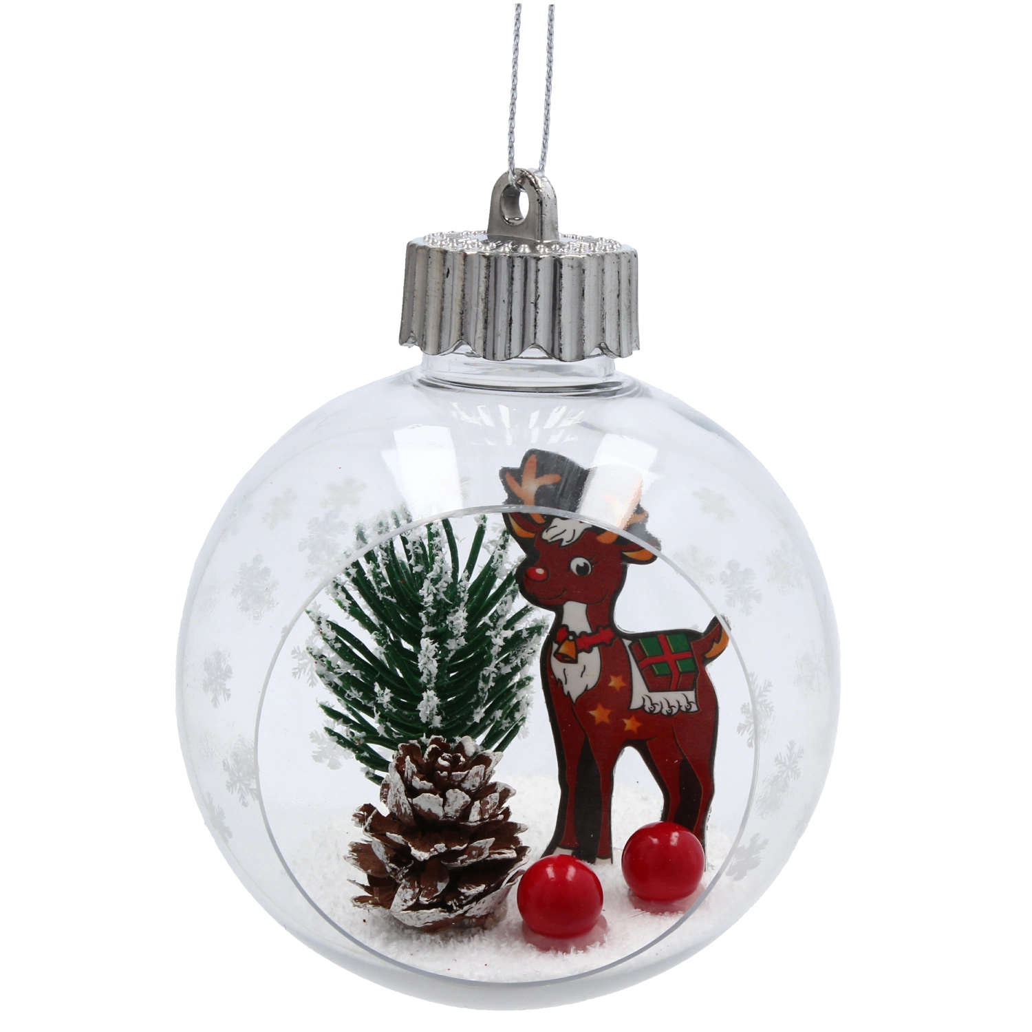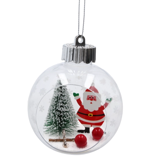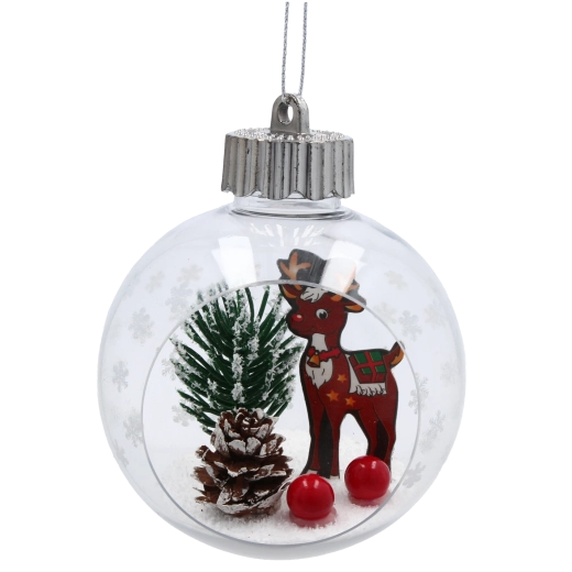 Deze kerstversiering in de vorm van een heldere bal met zilveren ophanglus bevat een klein winters tafereel – een met sneeuw bestrooid boompje, een dennenkegel, rode bessen en een figuurtje naar keuze. De combinatie van glas en licht kunststof zorgt voor een laag gewicht, veilig ophangen en een lange levensduur. Elk stuk is zorgvuldig afgewerkt met oog voor detail om een authentieke feestelijke sfeer te creëren.