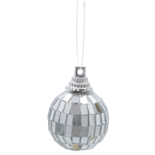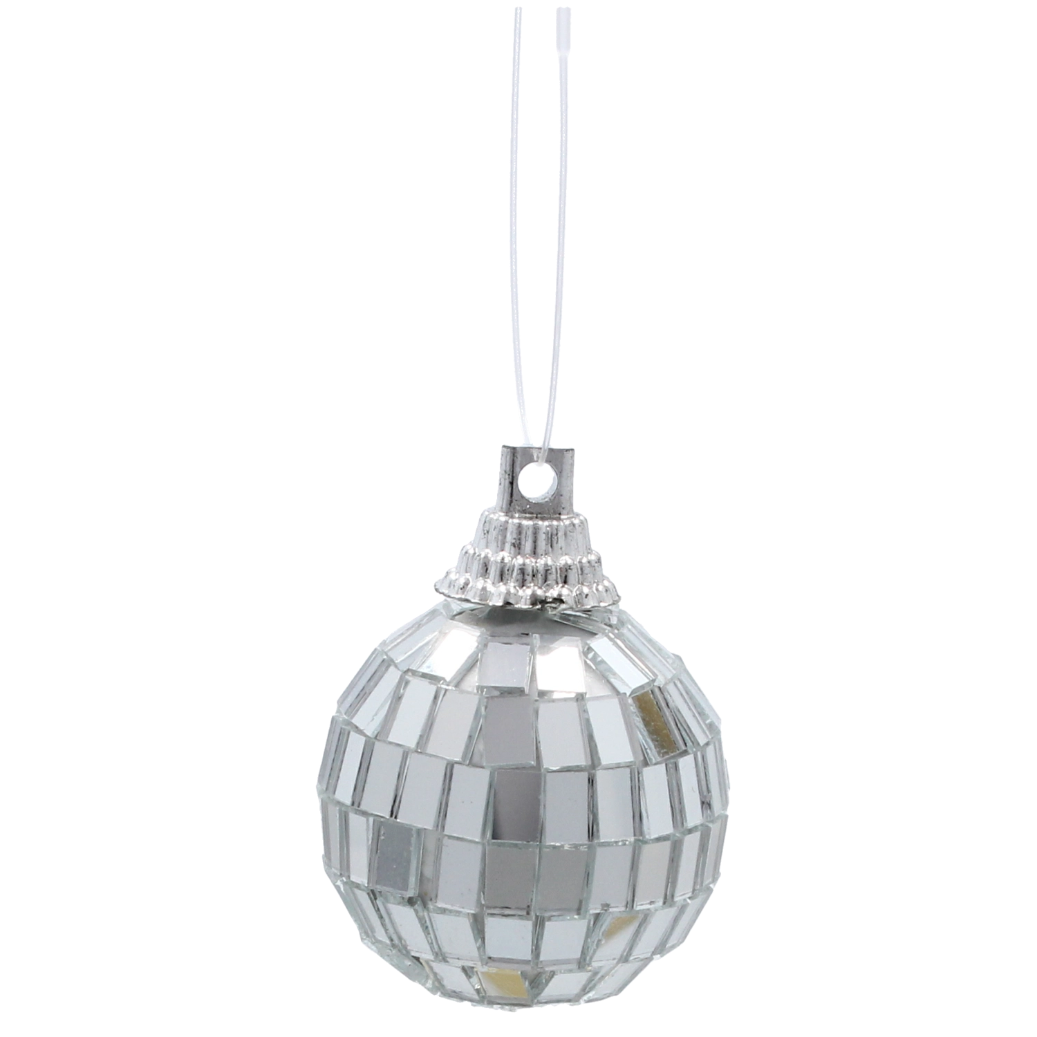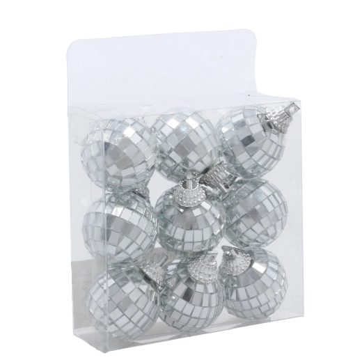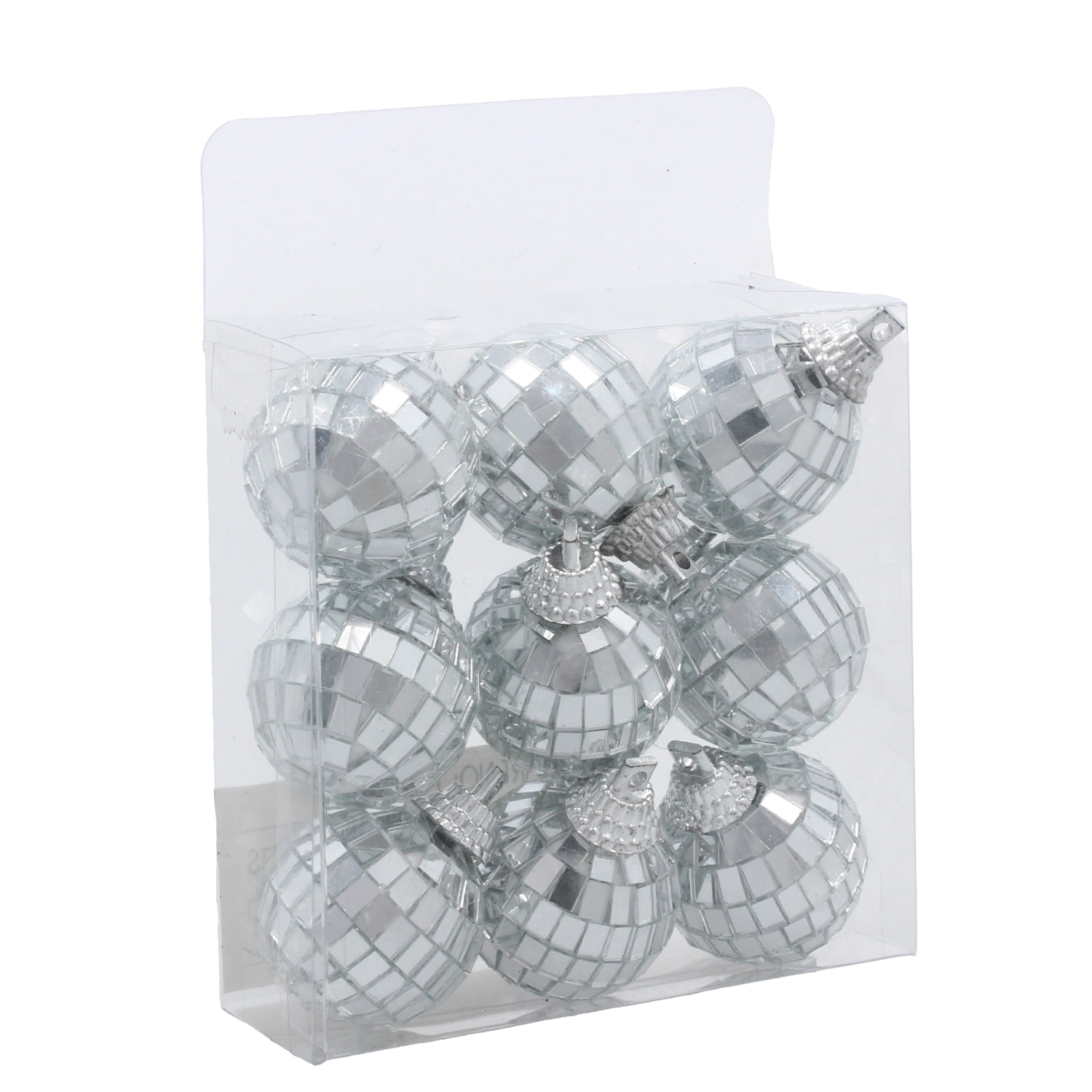 Geef je feestdecoratie een oogverblindende glans en een moderne stijl met een set van negen zilveren discoballen met een diameter van 3 cm. Het lichte en onbreekbare plastic zorgt voor veilig versieren, terwijl het spiegelende oppervlak het licht prachtig weerkaatst en een fonkelend effect creëert in de boom en andere arrangementen. Elke bal heeft een praktisch koordje voor eenvoudig ophangen.