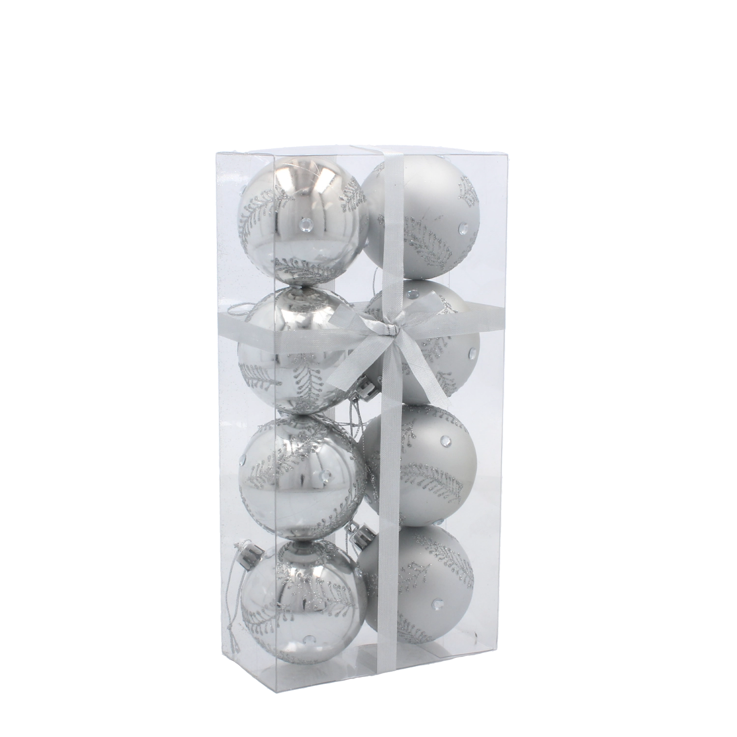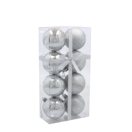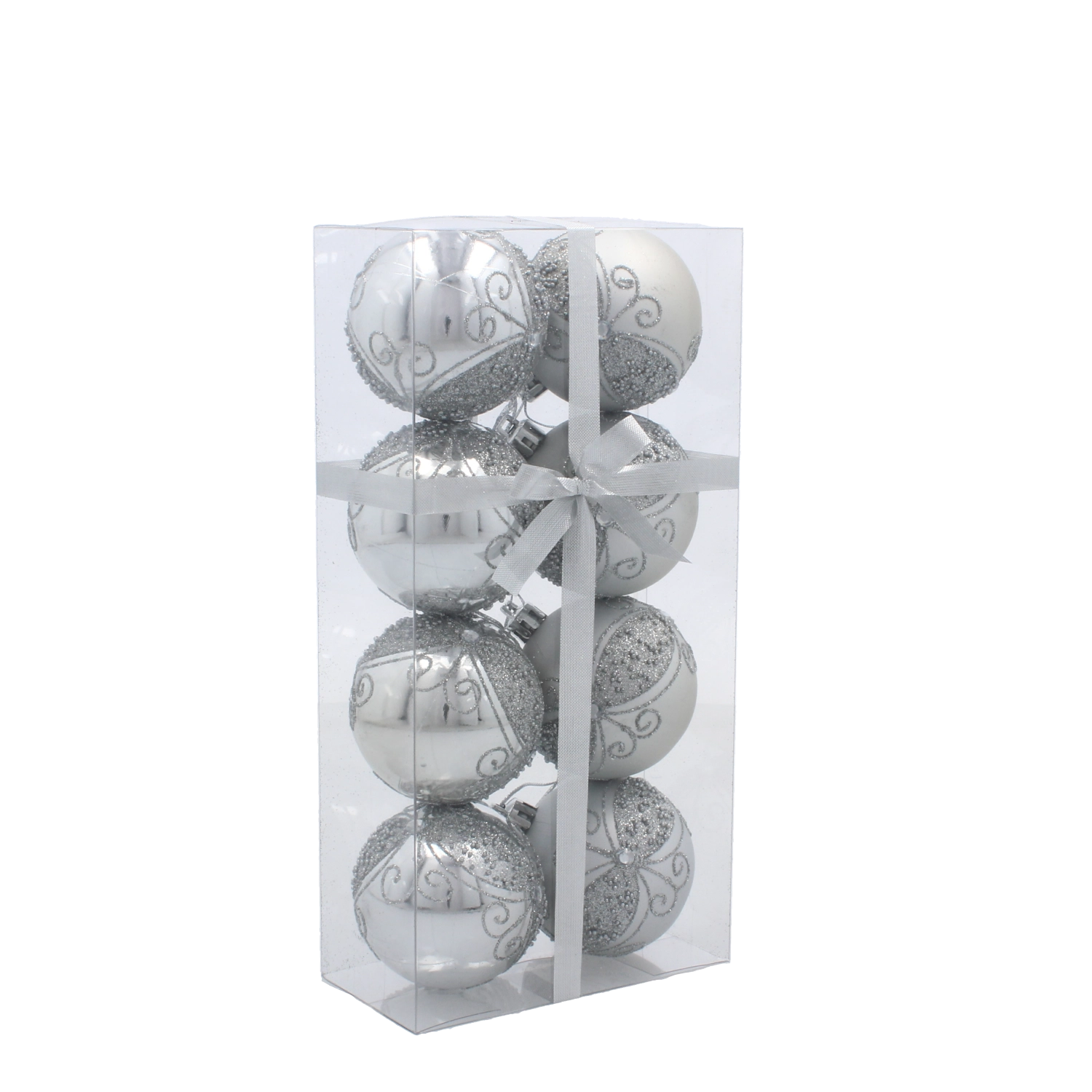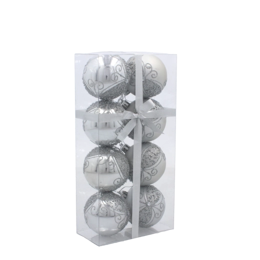 Geef je kerstboom een elegante en feestelijke uitstraling met een set van acht zilveren ballen met een diameter van 6 cm. De versieringen van lichtgewicht, onbreekbaar plastic zijn veilig voor kinderen en huisdieren en zorgen dankzij de verschillende patronen voor een harmonieuze en stijlvolle look in de boom. Eenvoudig te combineren met andere decoraties in zowel een traditioneel als modern thema.