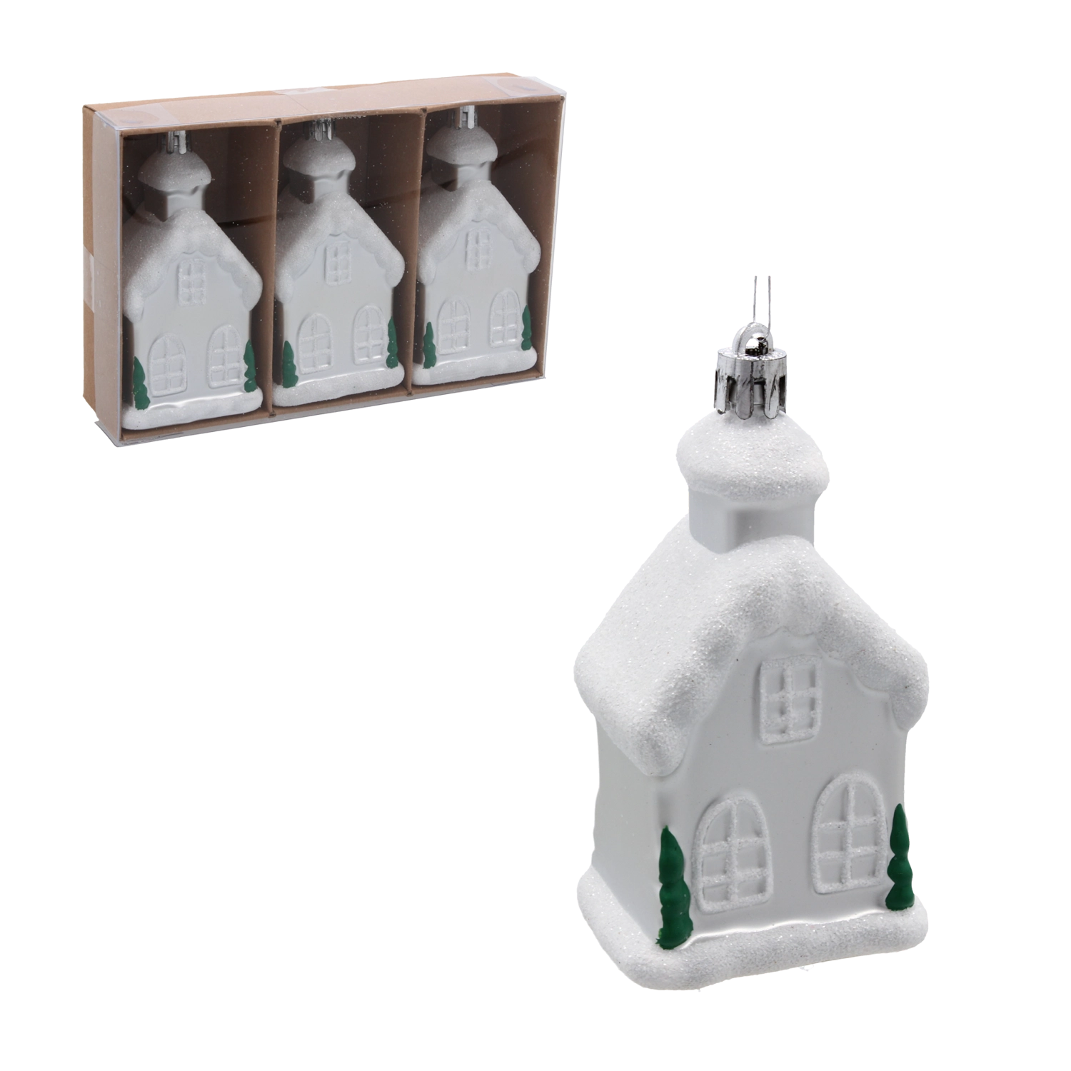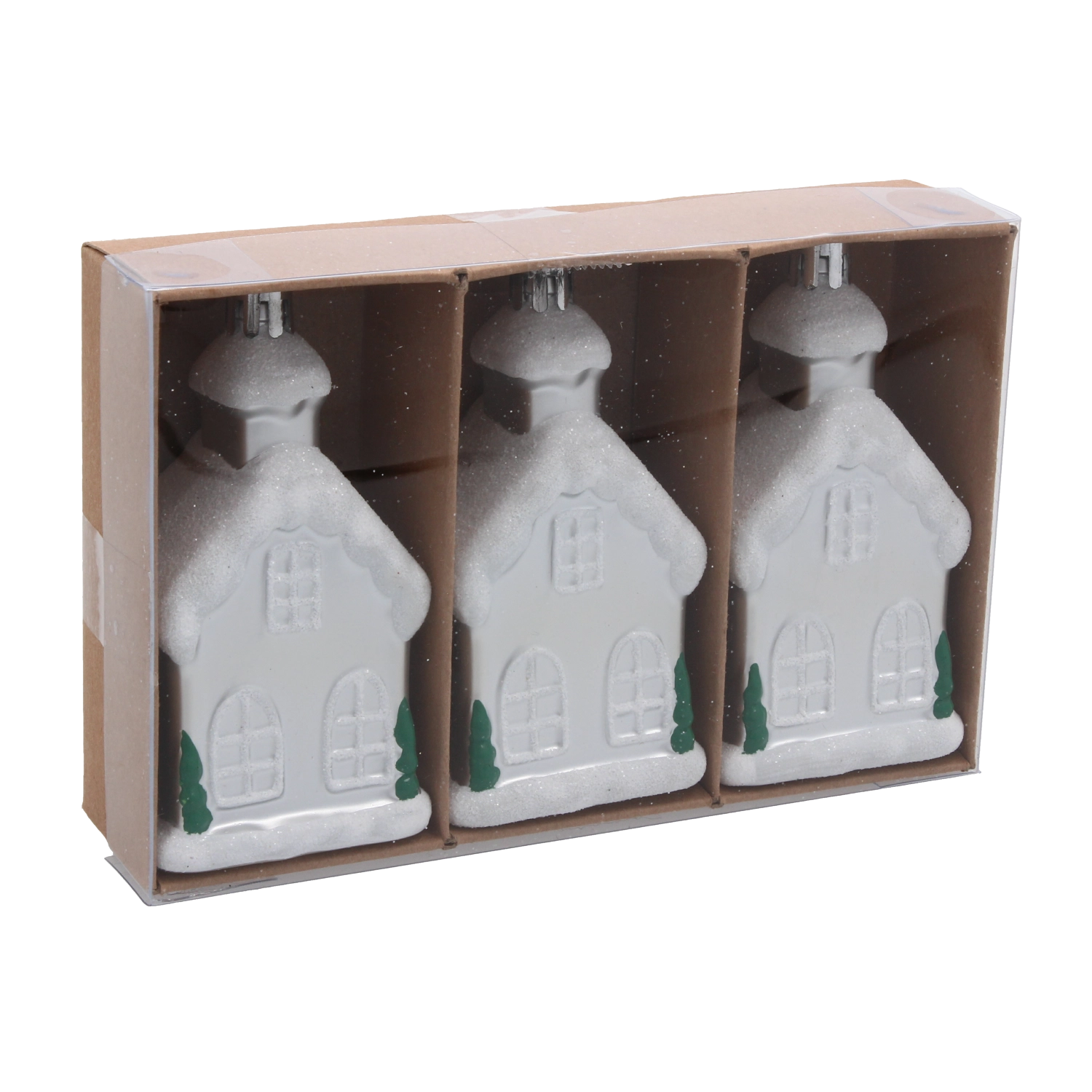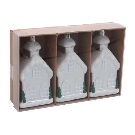 Creëer thuis een sprookjesachtige sfeer met een set van drie kerstornamenten in de vorm van huisjes, 9 cm hoog. De lichtgewicht plastic ornamenten zijn breukbestendig, hebben fijne details en glinsterende accenten die het licht prachtig weerkaatsen. Ideaal voor gezinnen met kinderen en huisdieren en perfect voor zowel traditionele als moderne decoratie.