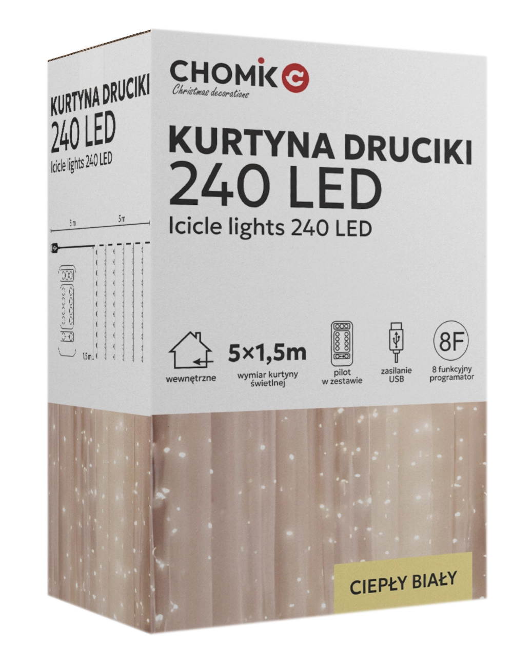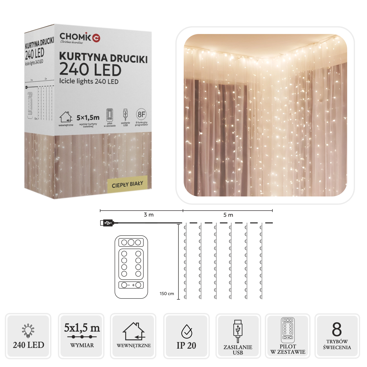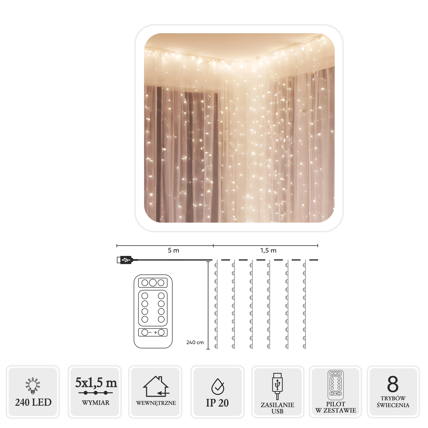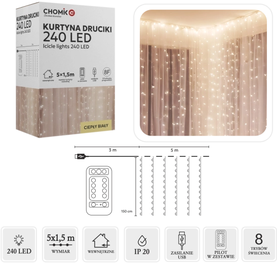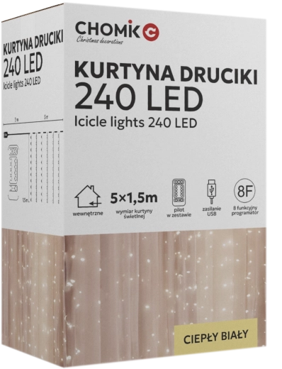 Creëer thuis en in de tuin een gezellige sfeer met een lichtgordijn met 240 micro-LED’s in warm wit. Afmetingen 5 x 1,5 m, elegante zilverkleurige draadjes, USB-voeding en afstandsbediening met 8 modi voor eenvoudig gebruik. Dankzij IP44 ook geschikt voor buitengebruik.