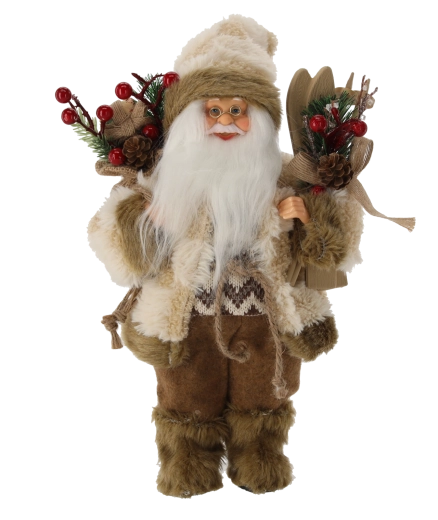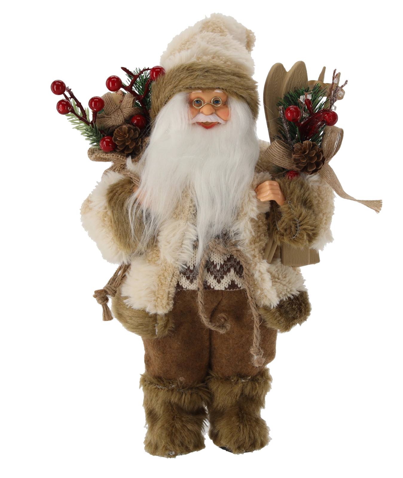 Elegante kerstdecoratie die een warm en feestelijk sfeertje in het interieur brengt. Een staande Kerstman in een beige jas met ski’s in de hand valt op door het detailrijke ontwerp, de neutrale kleurstelling en een stabiele basis voor een veilige plaatsing. Ideaal voor op een plank, dressoir of kersttafel.