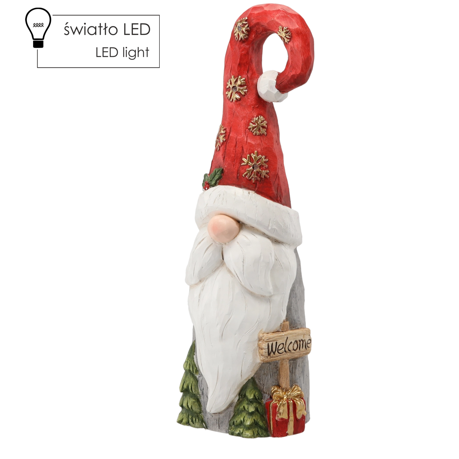 De geïntegreerde LED-verlichting geeft de decoratie een zachte gloed en accentueert de details van de kabouter. Ideaal voor gezellige avonden zonder fel licht.