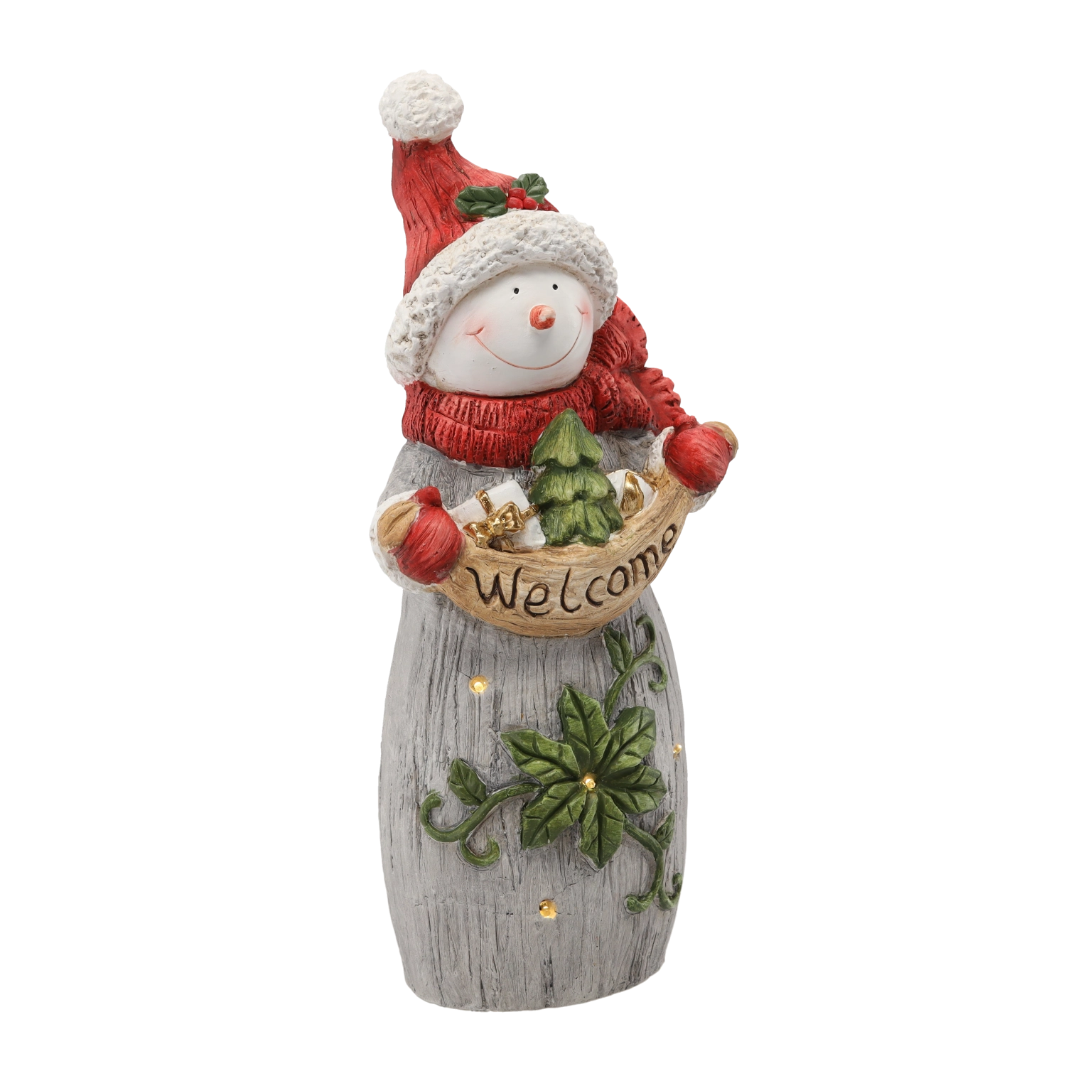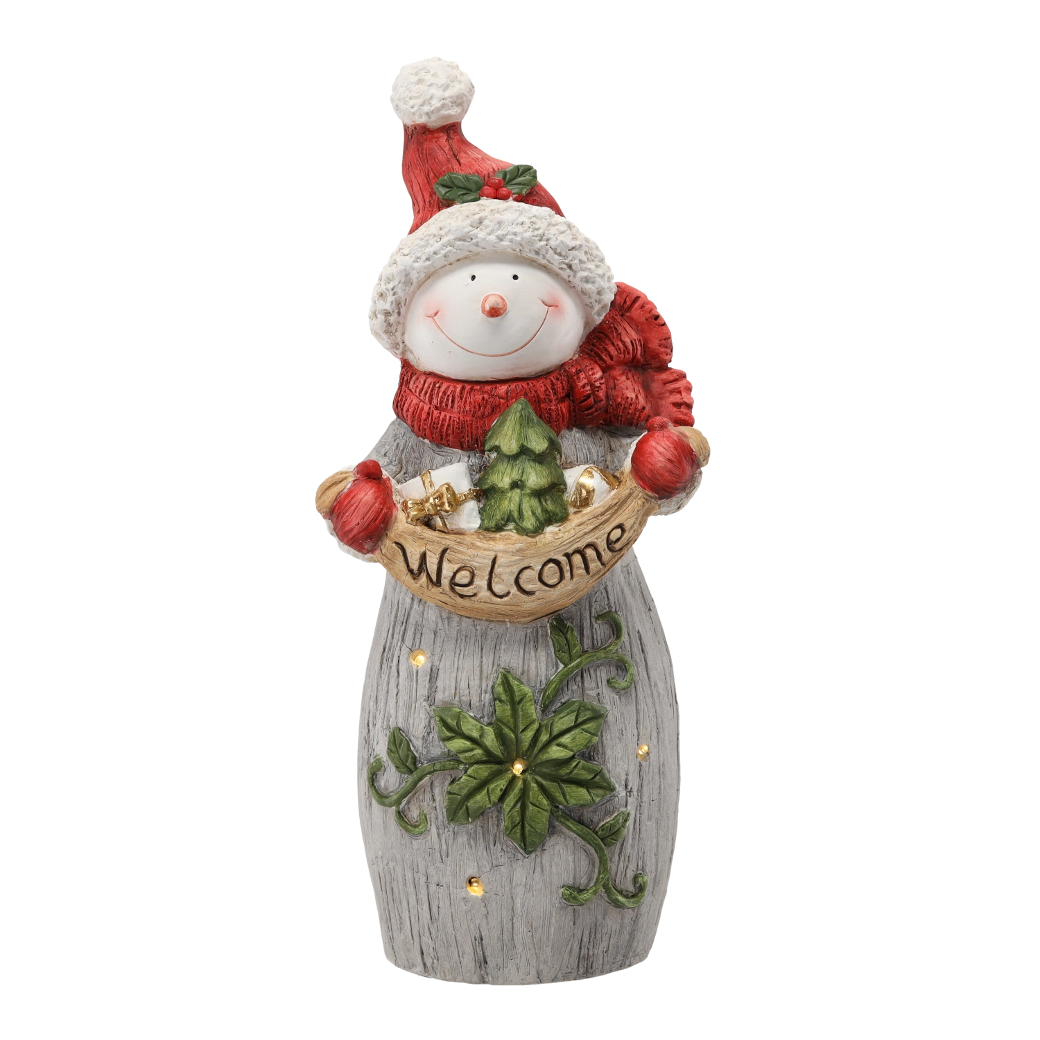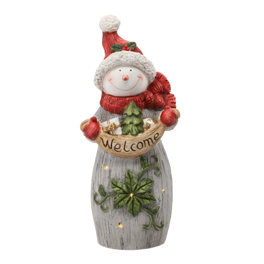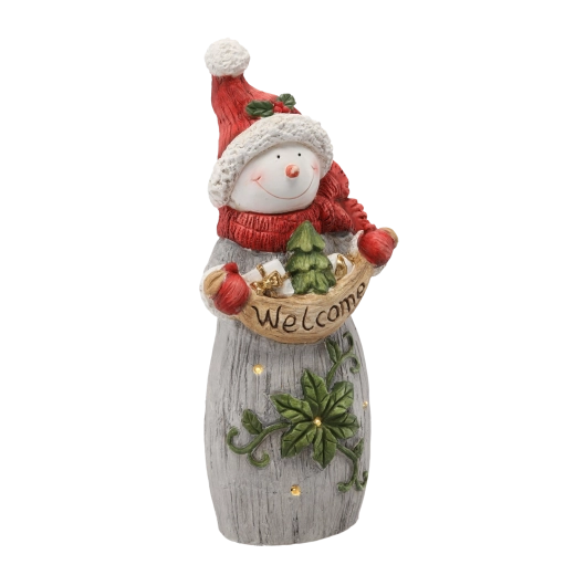 Deze vrolijke sneeuwpop met rode muts en sjaal wordt het middelpunt van je kerstdecoratie. Hij houdt een bord met WELCOME vast en dankzij de subtiele LED-lichtjes voegt hij een aangename, warme kerstsfeer toe aan je huis. Realistische details, reliëfstructuur en geschilderde accenten benadrukken de kwalitatieve afwerking.