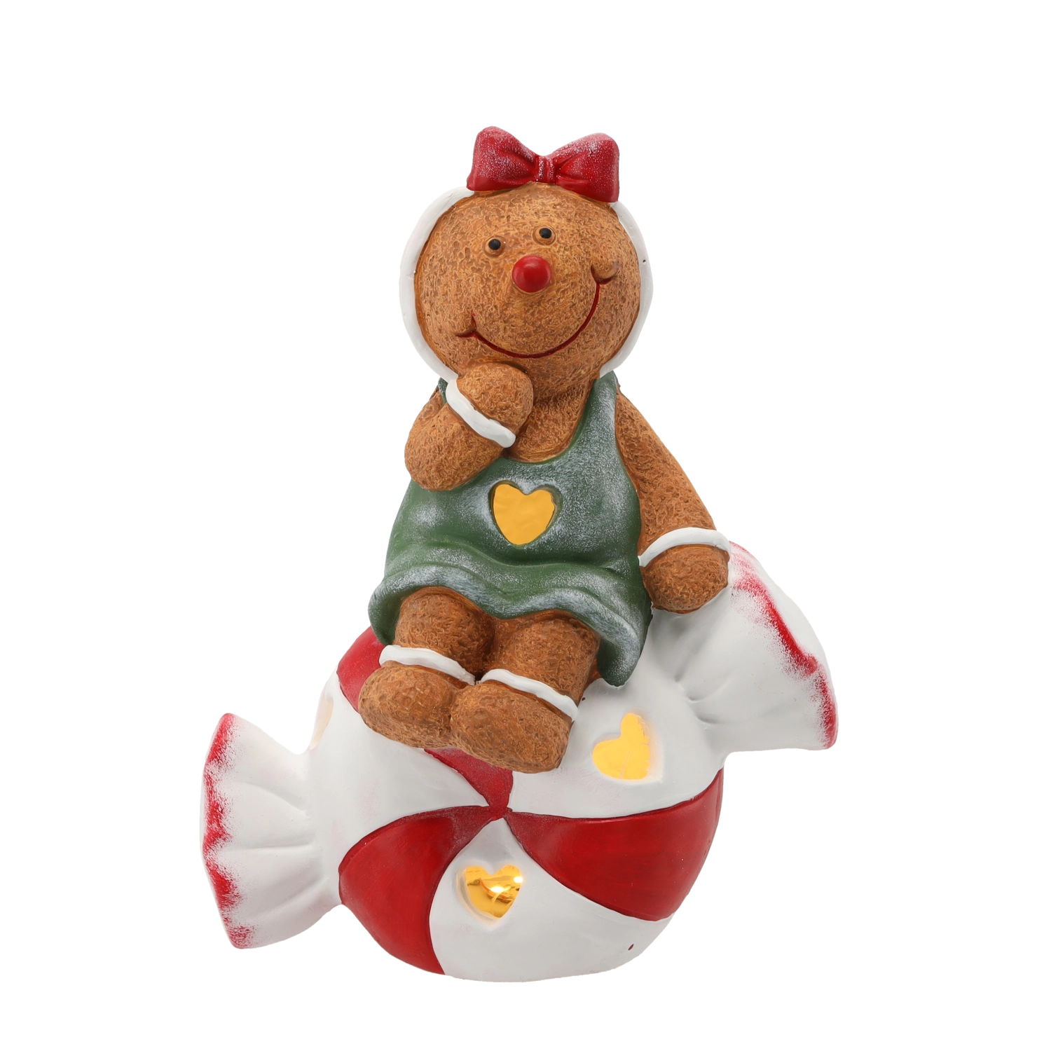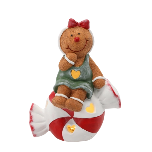 Schattige kerstfiguur van een peperkoekmannetje zittend op een snoepje met geïntegreerde LED-verlichting die je huis laat stralen. De combinatie van gedetailleerde afwerking, een warm lichteffect en duurzaam materiaal zorgt voor een indrukwekkende decoratie op een plank, vensterbank of feesttafel.