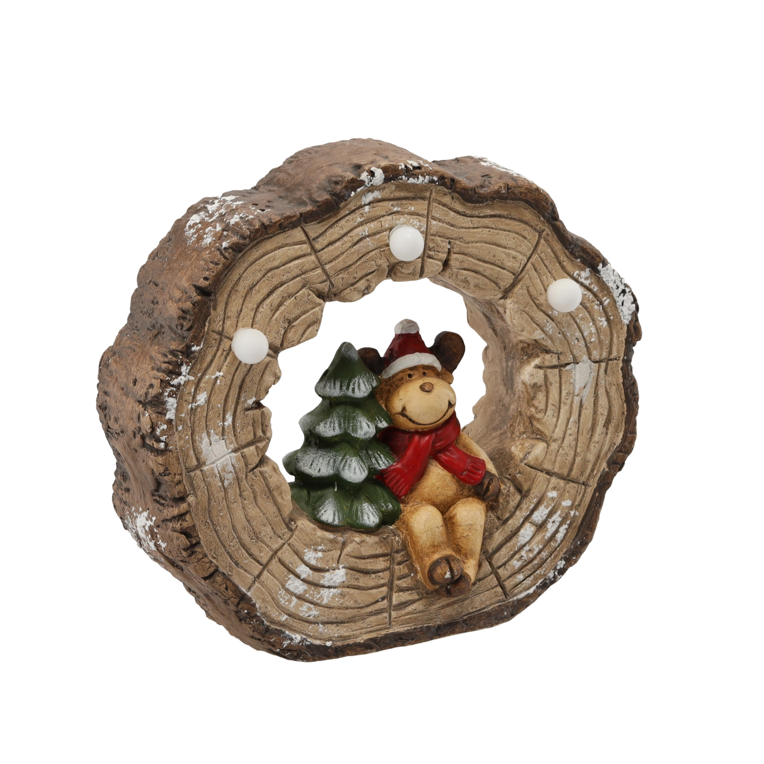 Creëer thuis een betoverende sfeer met deze indrukwekkende kerstdecoratie – een rendierfiguur in een boomstronk met LED-verlichting. De elegante afwerking van duurzame magnesia en het compacte formaat passen perfect op een plank, dressoir of feestelijke tafel. Werkt op 2× AAA-batterijen (niet inbegrepen) voor eenvoudige plaatsing zonder kabels.