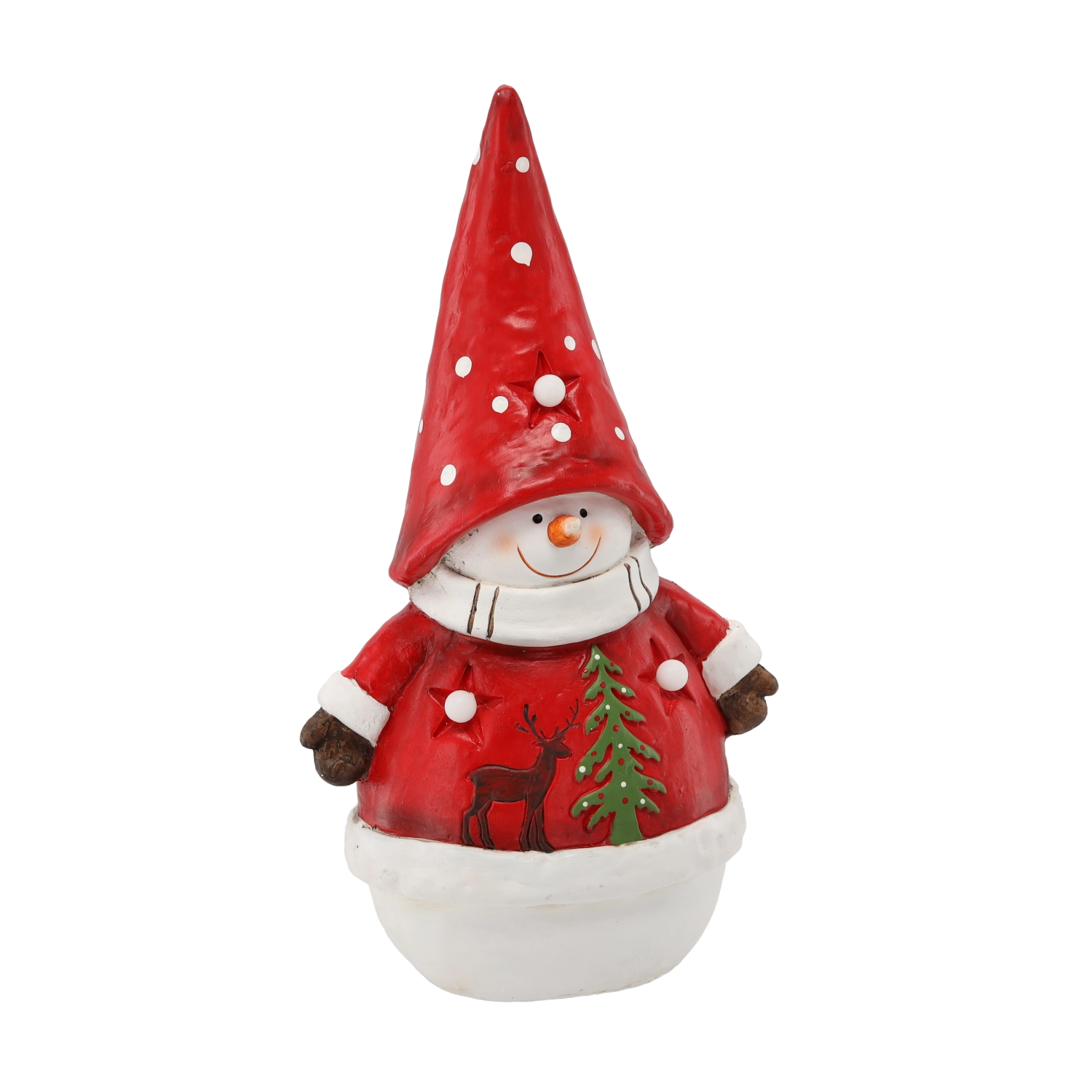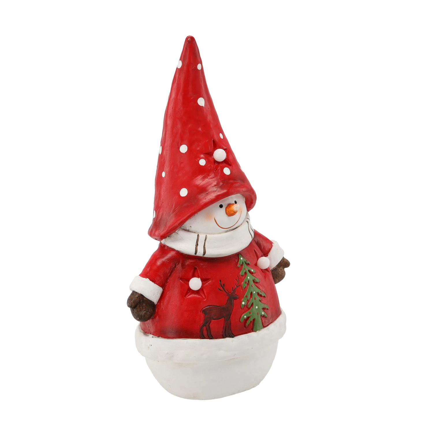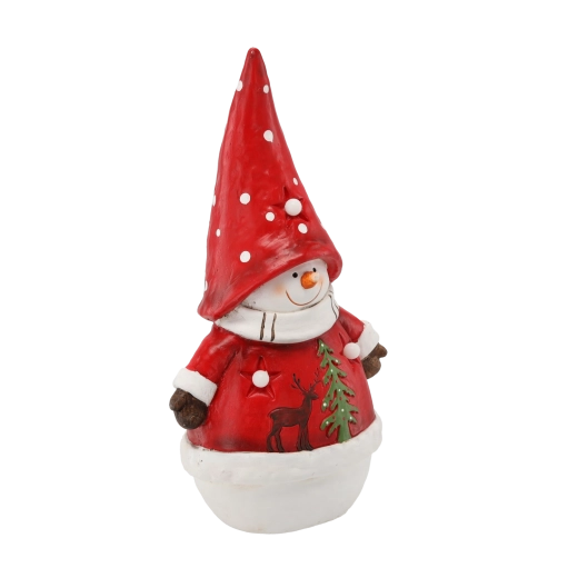 Sneeuwpop met rode muts en jas met witte stippen, rendier- en boommotief. De glanzende afwerking benadrukt de feestelijke charme.