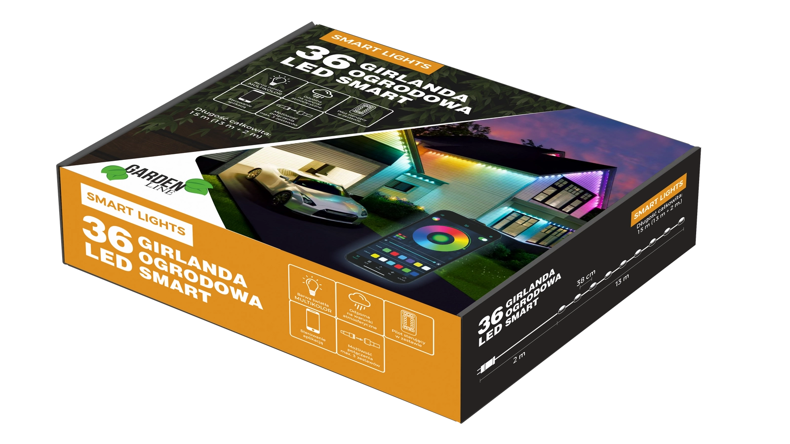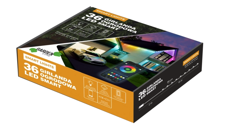 De IP65-bescherming maakt veilig buitengebruik het hele jaar door mogelijk. In de verpakking vind je uitgebreid montagemateriaal voor eenvoudige installatie – tot 144 montagemiddelen (stickers, schroeven, pluggen). De slinger kan tot 3 sets gekoppeld worden om de lengte van de verlichting eenvoudig uit te breiden.