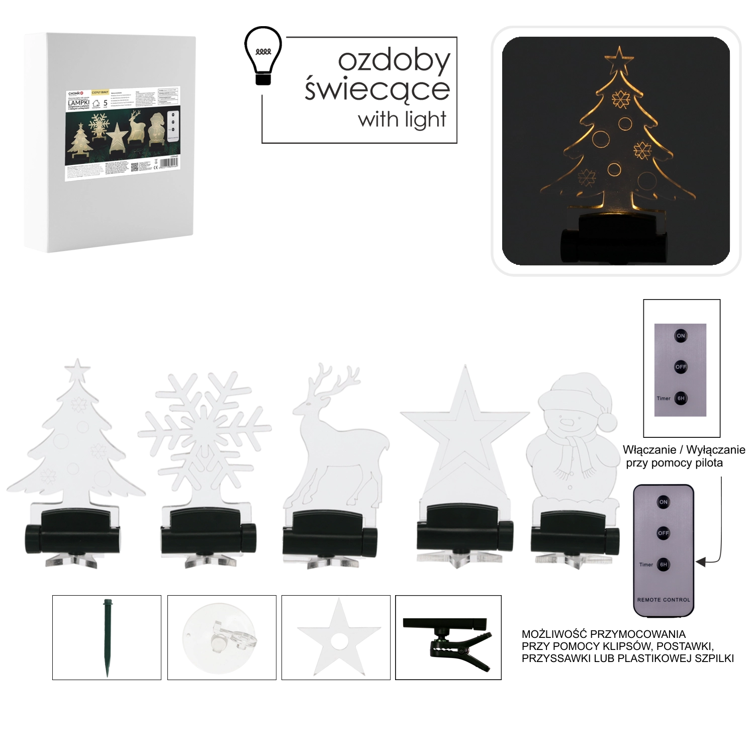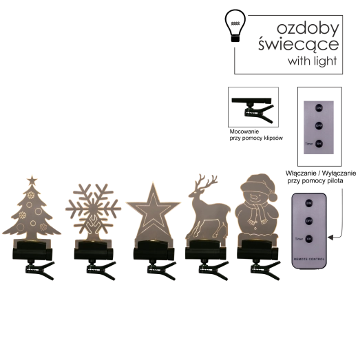 De praktische afstandsbediening met ON/OFF en timer zorgt voor gebruiksgemak – je schakelt de decoraties in vanaf de bank en kunt automatisch uitschakelen instellen. Elke mini-lamp werkt op 1× AAA-batterij (niet inbegrepen), de afstandsbediening heeft een CR2025-batterij in de verpakking.