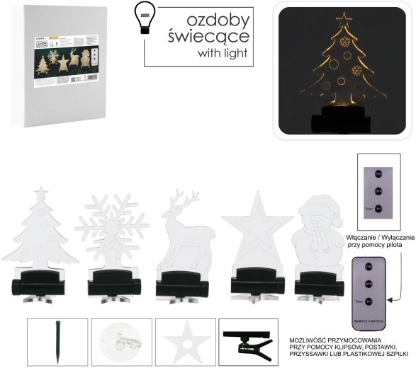 betoverende kerstsfeer in huis met een set van 5 acryl LED-decoraties in de vorm van een boompje, sneeuwvlok, ster, rendier en sneeuwman. Warm wit licht en verschillende bevestigingen (zuignap, clip, standaard, staafje) zorgen voor eenvoudige plaatsing op het raam, de tafel, een krans of in een bloempot. Het bedienen wordt eenvoudiger met de afstandsbediening met timer./p>