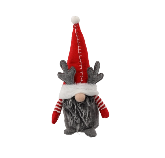 Deze decoratieve kabouter in rendierstijl valt op door de hoge muts met witte rand, grijze geweitjes en een lange, zachte baard. Dankzij de zachte textiele materialen en zorgvuldige afwerking is hij ideaal als seizoensdecoratie voor de woonkamer, hal of kantoor.