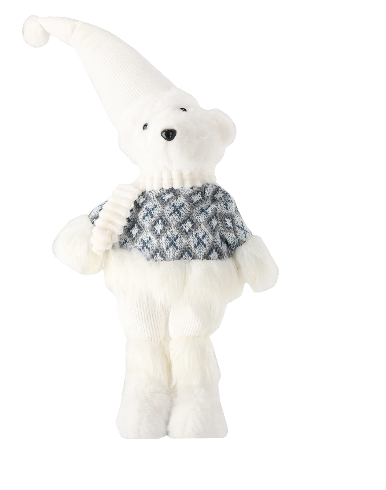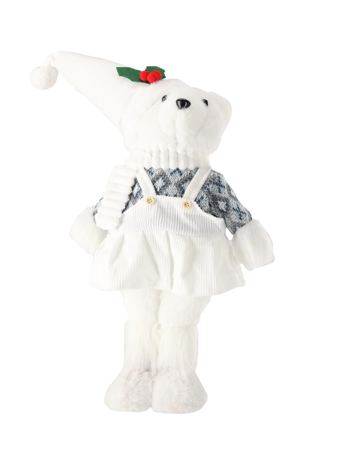 Een schattige witte kerstbeer van 50 cm hoog brengt een magische feestelijke sfeer in huis. Verkrijgbaar in de variant jongen of meisje, met zorgvuldig uitgewerkte details en ideaal als interieur kerstdecoratie bij de boom, op de haard of op de feesttafel.