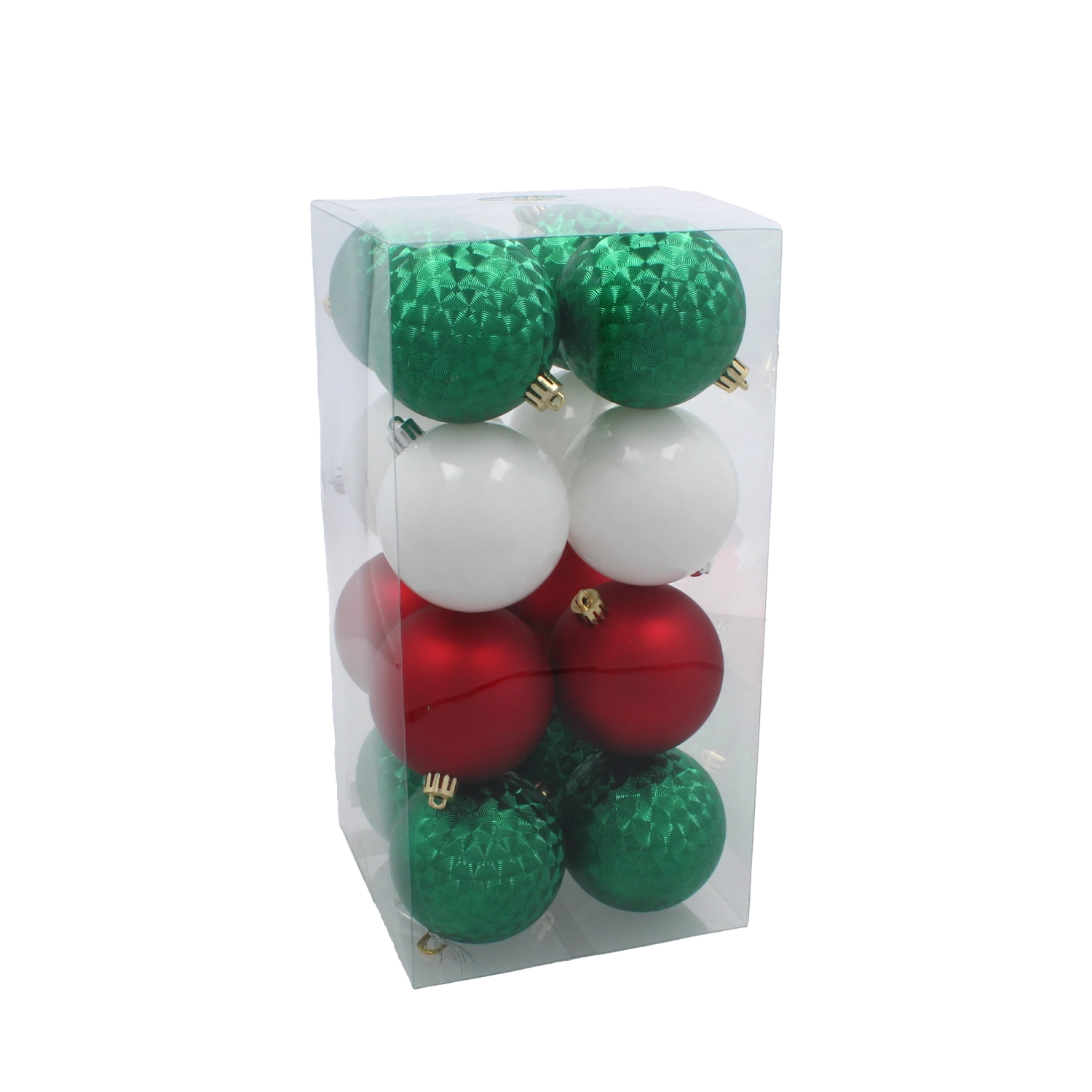 Stijlvolle set van 16 kerstballen met een diameter van 8 cm in rood, groen en wit, die je boom een traditionele en elegante uitstraling geven. De combinatie van matte en glanzende afwerkingen zorgt voor een prachtige schittering in het licht. Het duurzame kunststof materiaal is veilig voor kinderen en huisdieren en garandeert een lange levensduur. Inclusief praktische verpakking voor eenvoudig opbergen.