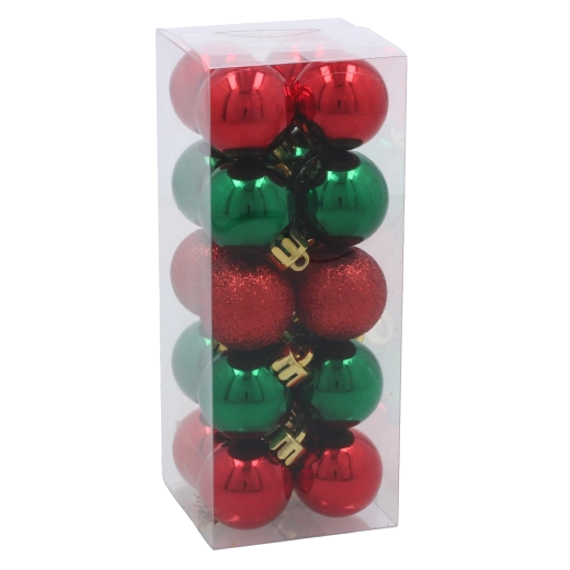 Deze set kerstballen van 3 cm in de klassieke combinatie van rood en groen geeft je boom en interieur een traditionele en elegante uitstraling. Licht maar duurzaam kunststof zorgt voor een lange levensduur, veilig gebruik en eenvoudige hantering.
